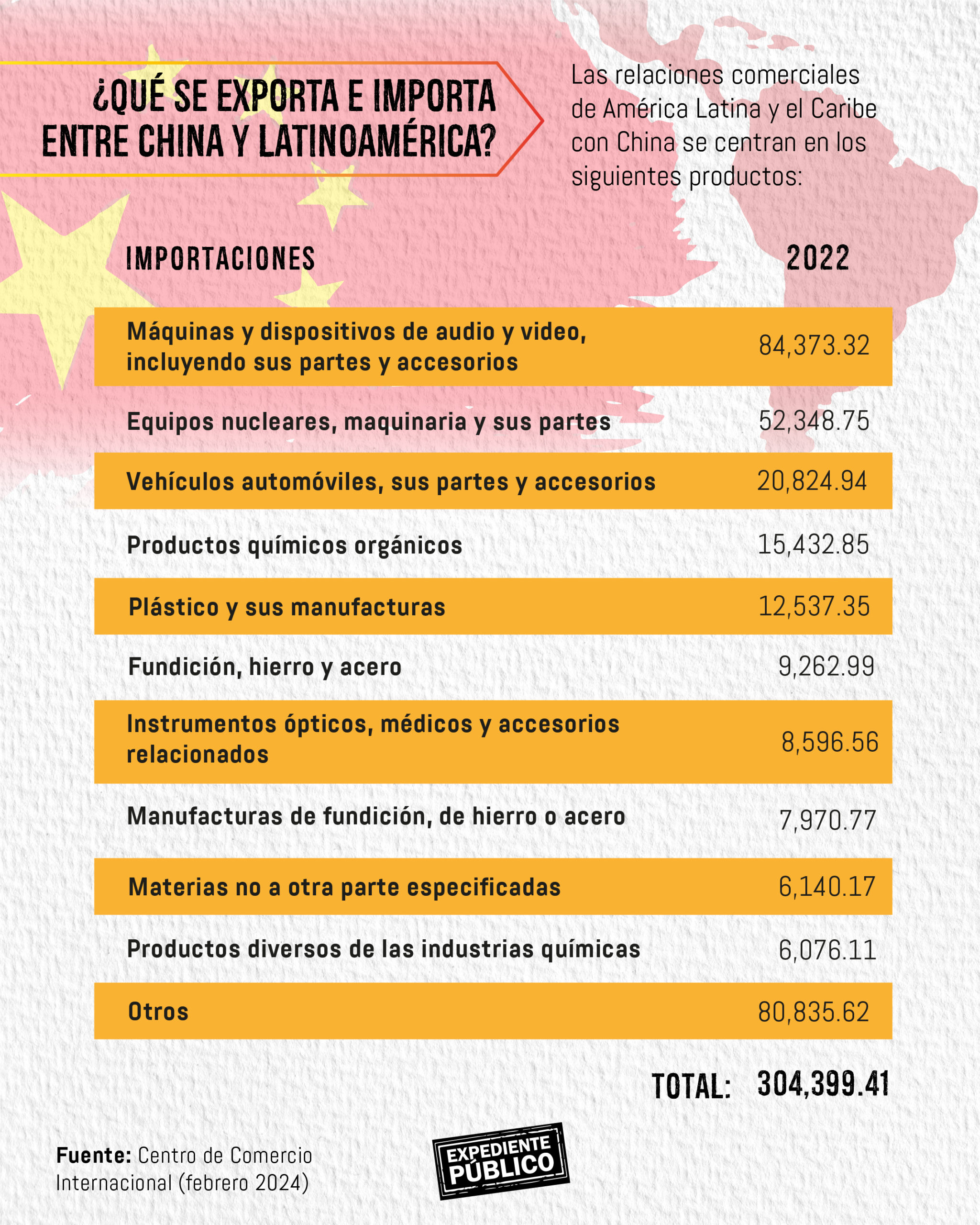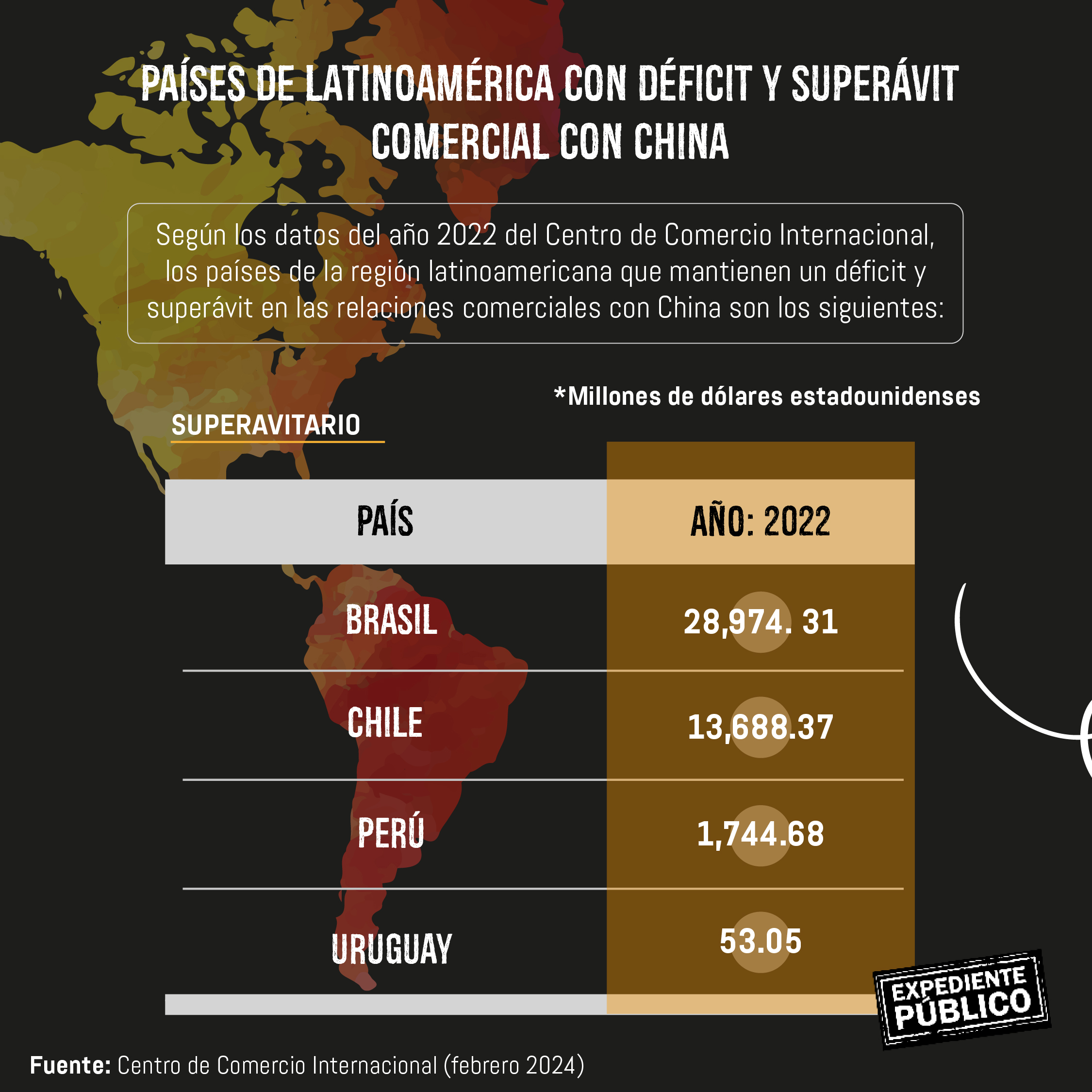 Conforme a los datos más recientes del Centro de Comercio Internacional, los países de América Latina que muestran un déficit en la balanza comercial con el país asiático son México, Colombia, Argentina, Guatemala y Panamá.