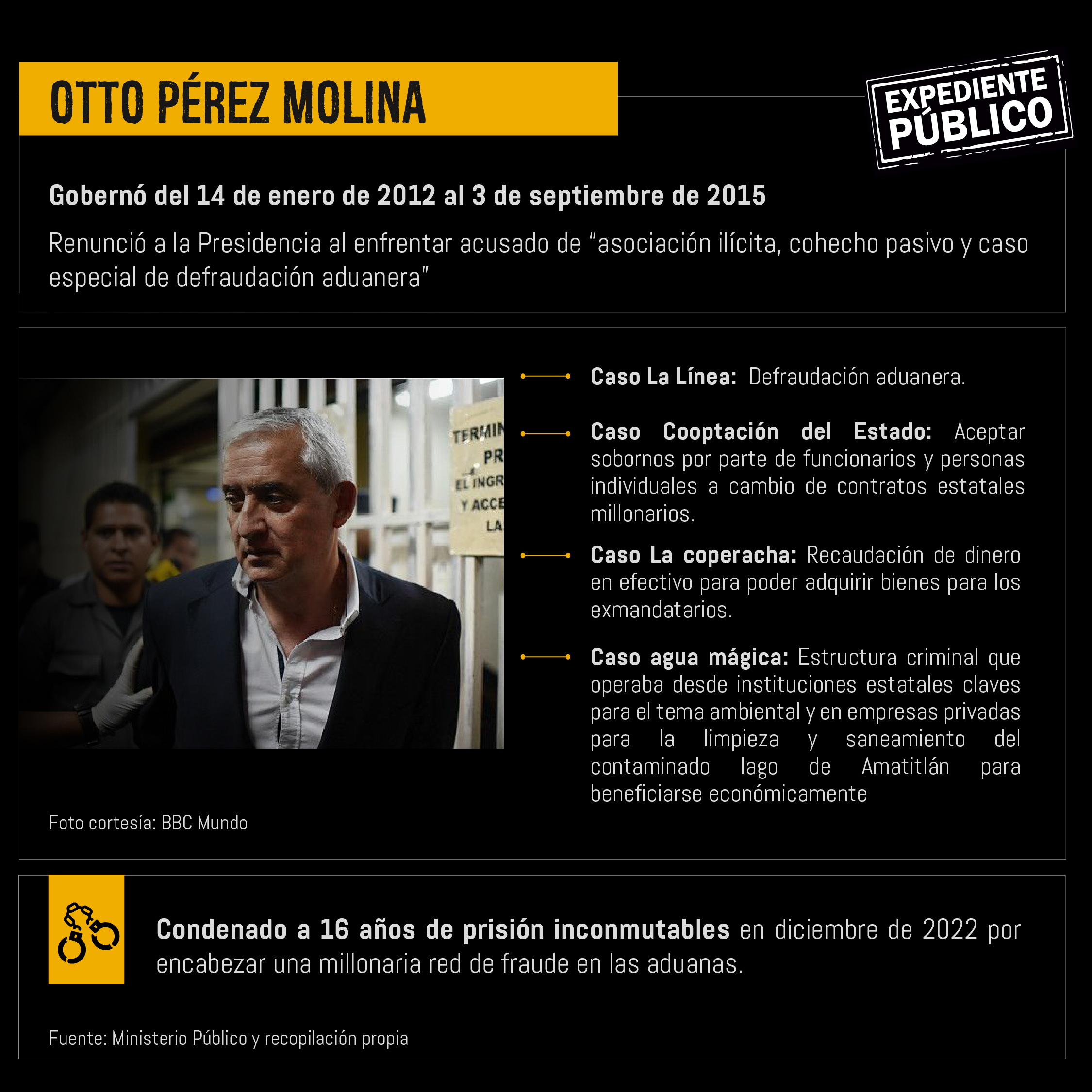 *Después de siete años de prisión preventiva y 10 meses de su primera condena, el miércoles 7 de septiembre el exmandatario, Otto Pérez Molina, se declaró culpable del segundo caso de corrupción y lo condenan a ocho años de prisión.