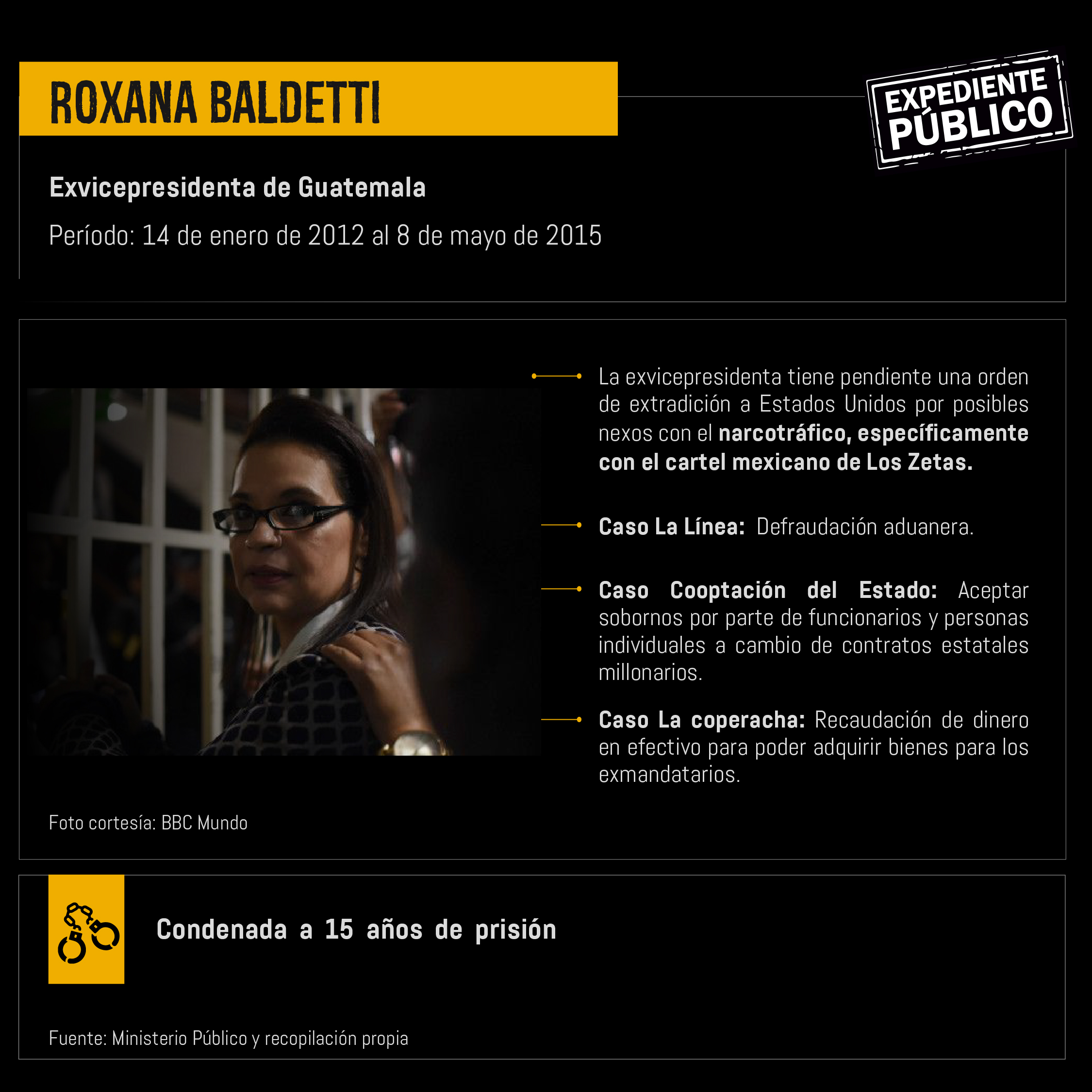 La exvicepresidenta de Guatemala tiene más acusaciones pendientes de resolución entre ellos una extradición a Estados Unidos por posibles nexos con el narcotráfico, específicamente con el cartel mexicano de Los Zetas.