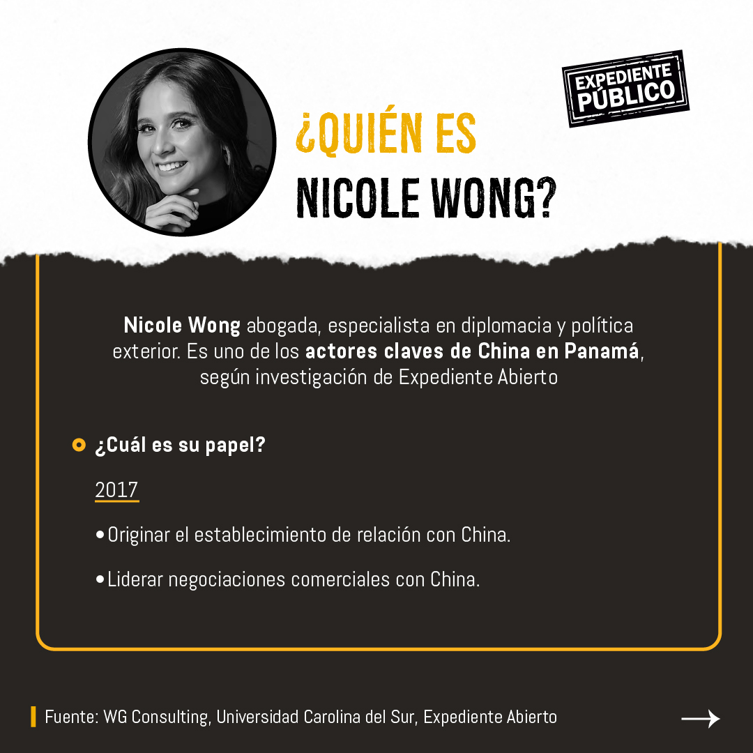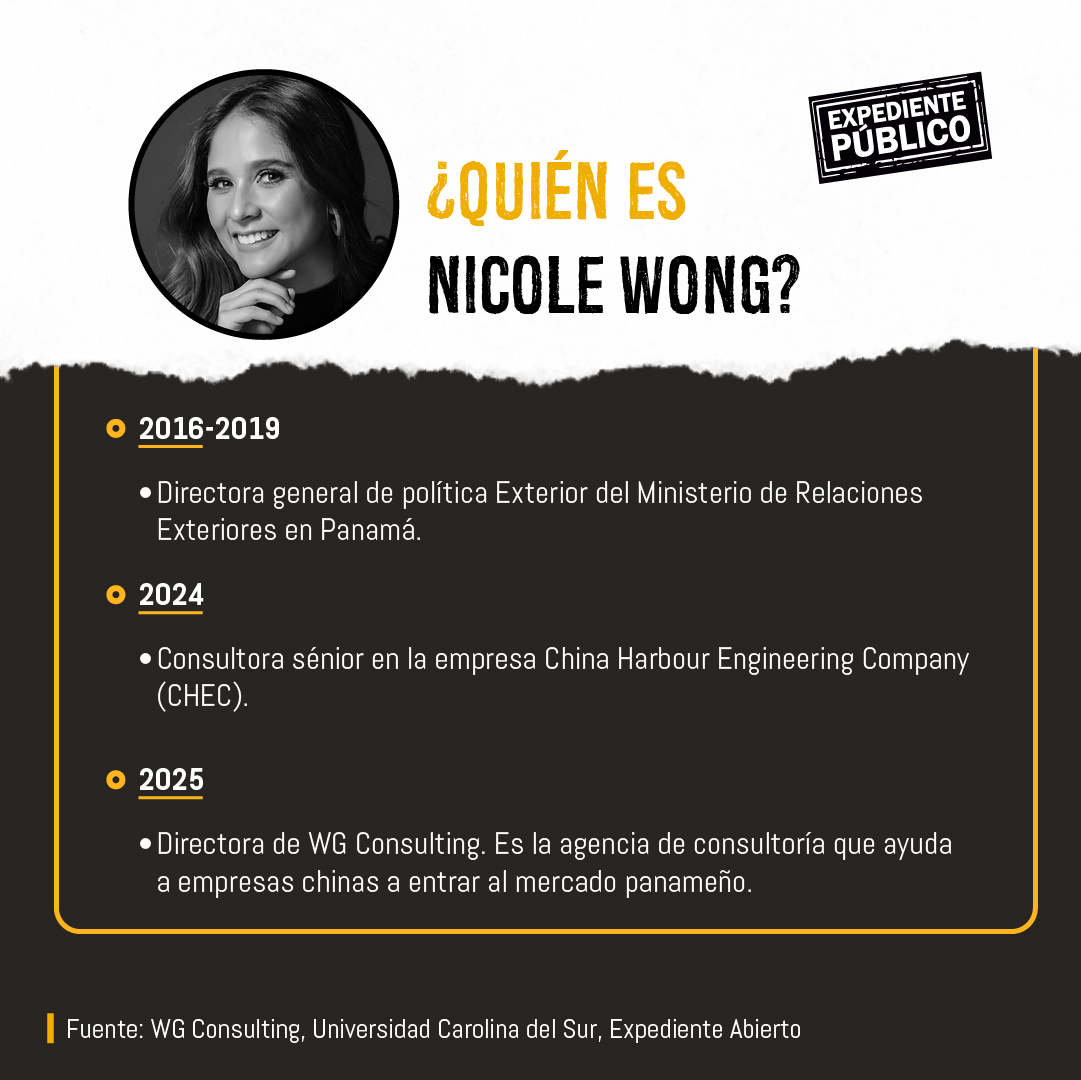 Otra de las figuras más influyentes para China en Panamá es la abogada y exfuncionaria de Relaciones Exteriores Nicole Wong, a quien le cancelaron la visa de entrada a Estados Unidos en mayo de 2024.