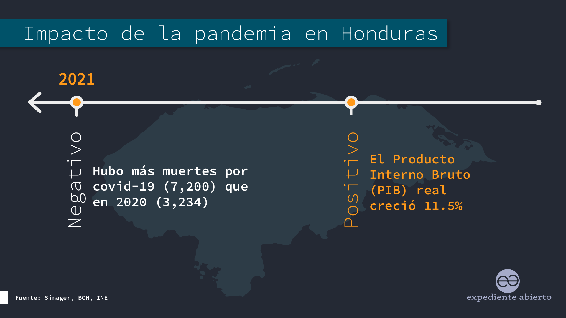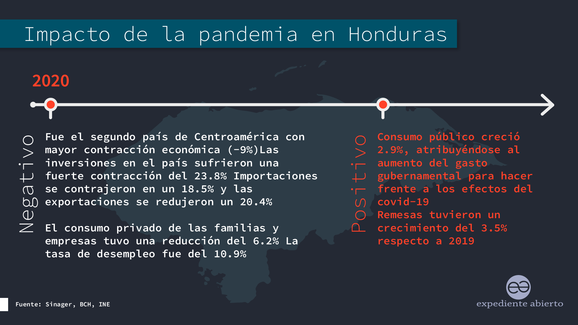 En 2020, Honduras fue el tercer país de Centroamérica que menos medidas implementó para combatir el impacto socioeconómico de la pandemia del COVID-19 y el segundo con la mayor contracción económica a causa de la crisis sanitaria que, además, visibilizó como nunca antes la corrupción estructural durante la administración del ex presidente Juan Orlando Hernández.