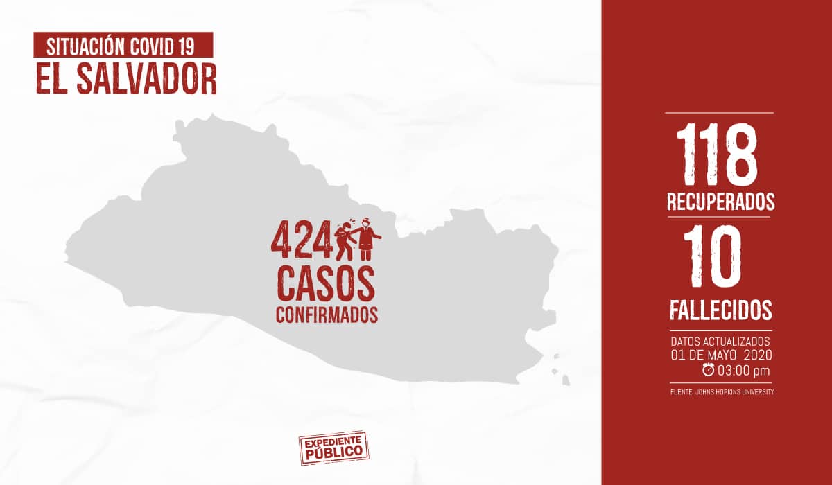 Según los datos oficiales, los casos positivos han aumentado a 424 y las muertes a 10 personas. De los 395 casos, 167 son mujeres y 228 son hombres. El número de recuperados ascendió a 118. La zona más afectada es la capital, San Salvador, con el mayor número de casos positivos y la población más afectada son los que tienen de 20 a 39 años de edad.