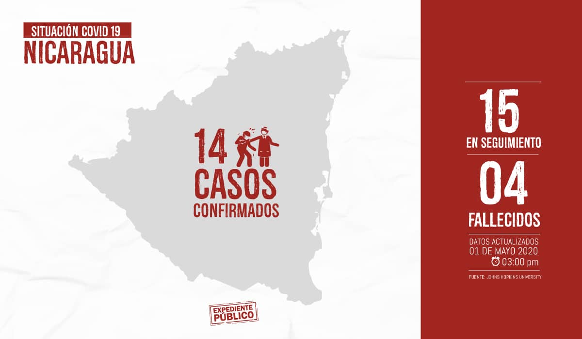 Según los datos oficiales, existen 14 casos positivos y 4 muertes, hasta el 1 de mayo. Sin embargo, hay informes del Observatorio Ciudadano COVID-19, donde expresan que en Nicaragua hay 370 presuntos casos de coronavirus. El Observatorio también denunció 17 irregularidades reportadas en torno a la pandemia en los trabajadores de la salud, como amenazas, hostigamiento, arbitrariedades del Estado, entre otras.