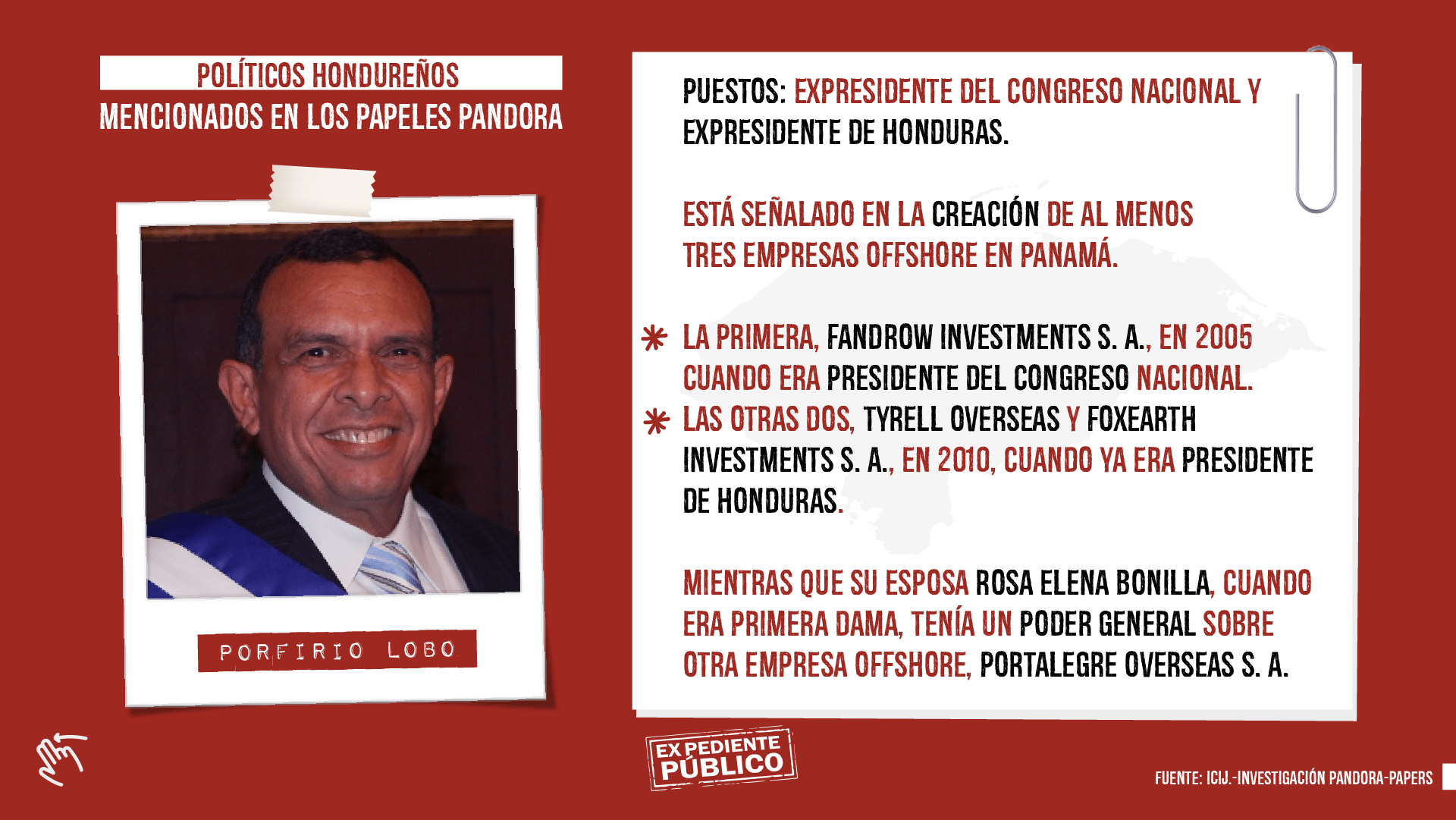 Lobo está señalado de crear al menos tres empresas offshore en Panamá. La primera, Fandrow Investments S. A., en 2005 cuando era presidente del Congreso Nacional, y las otras dos, Tyrell Overseas y Foxearth Investments S. A., en 2010, cuando ya era presidente de Honduras.