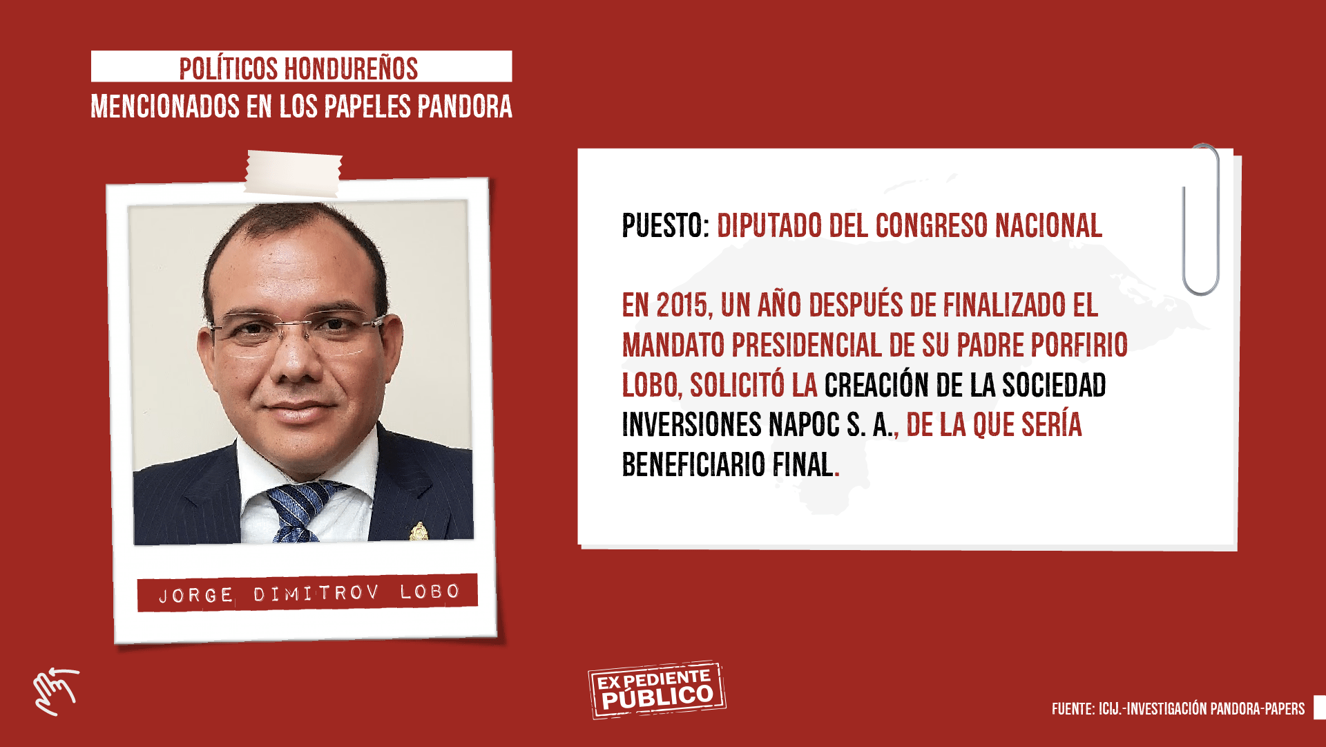 También el hijo del exmandatario, Jorge Lobo, quien es diputado del Congreso Nacional, solicitó en 2015 la creación de la sociedad Inversiones Napoc S. A. de la que era beneficiario final.