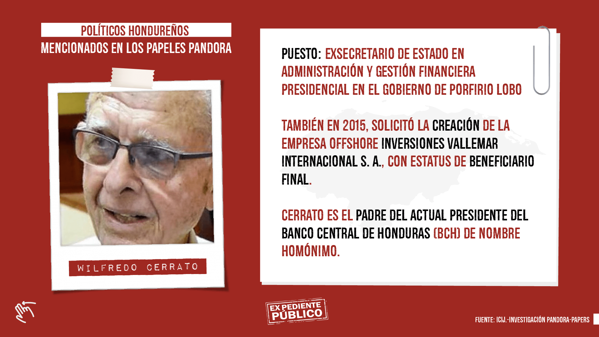 A su vez, el exadministrador del Congreso Nacional y exsecretario de Estado en Administración y Gestión Financiera Presidencial en los dos períodos en que Lobo presidió esos poderes del Estado, Wilfredo Cerrato Durón, solicitó en 2015 la creación de Inversiones Vallemar Internacional S.A.