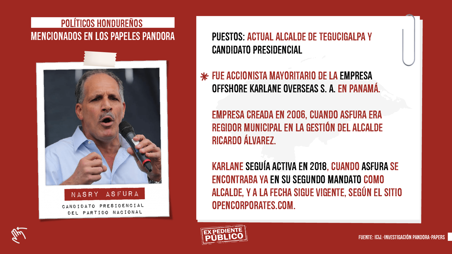Según esa investigación, Asfura fue accionista mayoritario de la empresa offshore Karlane Overseas S. A. en Panamá, la cual fue creada en 2006 cuando el político fungía como regidor municipal en la gestión del alcalde Ricardo Álvarez.