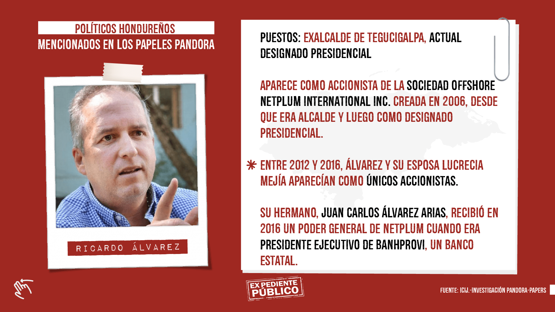 Además de Asfura, su antecesor en la alcaldía capitalina y actual designado presidencial, Ricardo Álvarez, es mencionado también como accionista de una empresa en Panamá que data de 2006, Netplum International Inc. y con la que tiene vínculos al menos hasta 2012.
