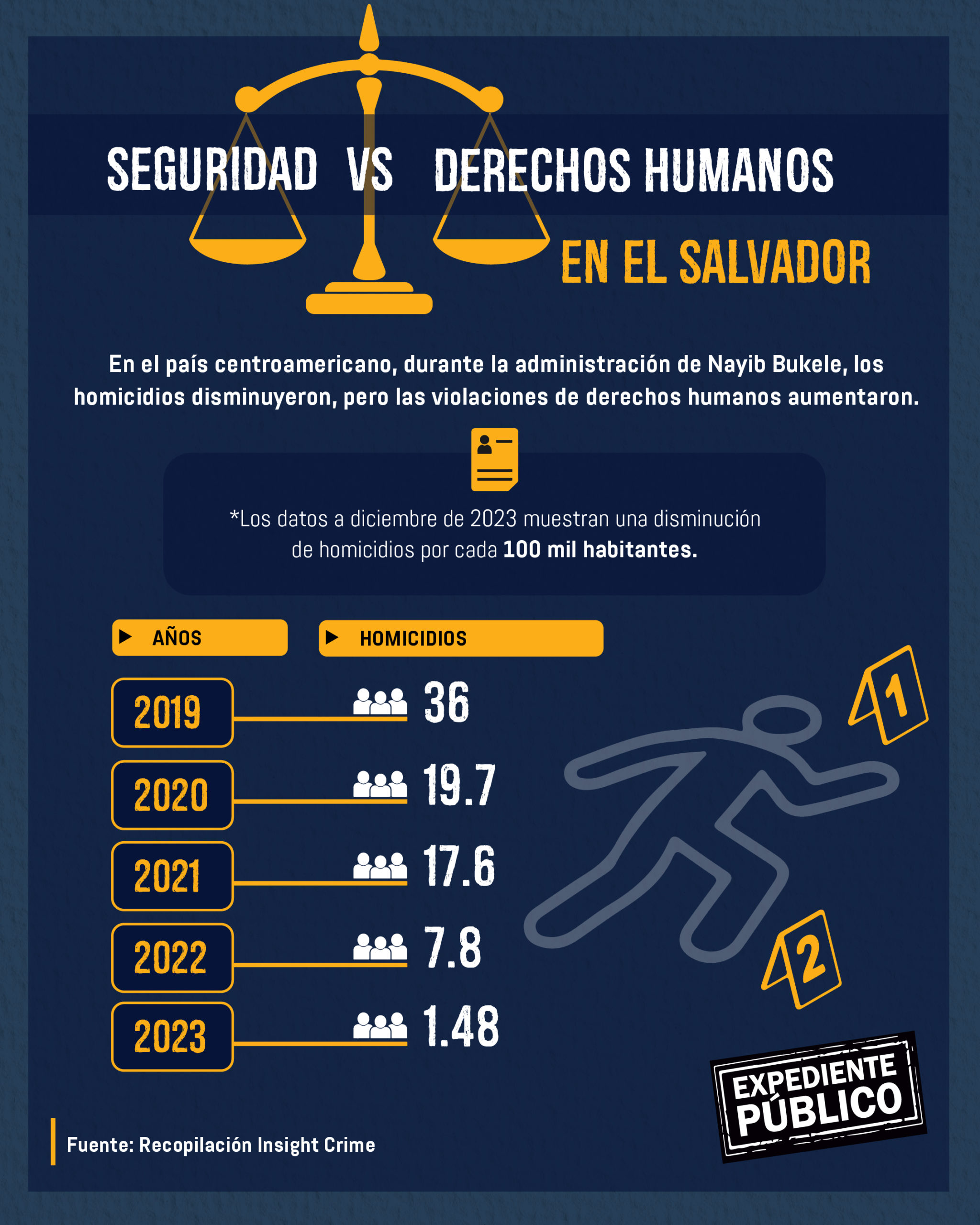 Hasta antes del régimen de excepción, por cada 100 mil habitantes había 36 asesinatos en 2019 y esos números disminuyeron hasta posicionarse en 1.48 homicidios en 2023.