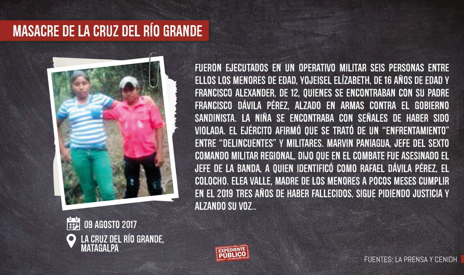Y el caso más reciente y emblemático: la masacre de la Cruz del Río Grande, municipio de la Costa Caribe Sur, en noviembre del 2017, cuando el Ejército emboscó y mató a seis personas, entre ellos, a Rafael Pérez Dávila, alias comandante Colocho, y dos adolescentes hijos suyos y de la campesina Elea Valle.Un defensor de derechos humanos, entrevistado para este informe, destacó que la impunidad registrada en todos estos casos “es altísima”. Nunca hubo una investigación oficial para determinar responsabilidades individuales y procesar en caso de que se determinaran crímenes.
