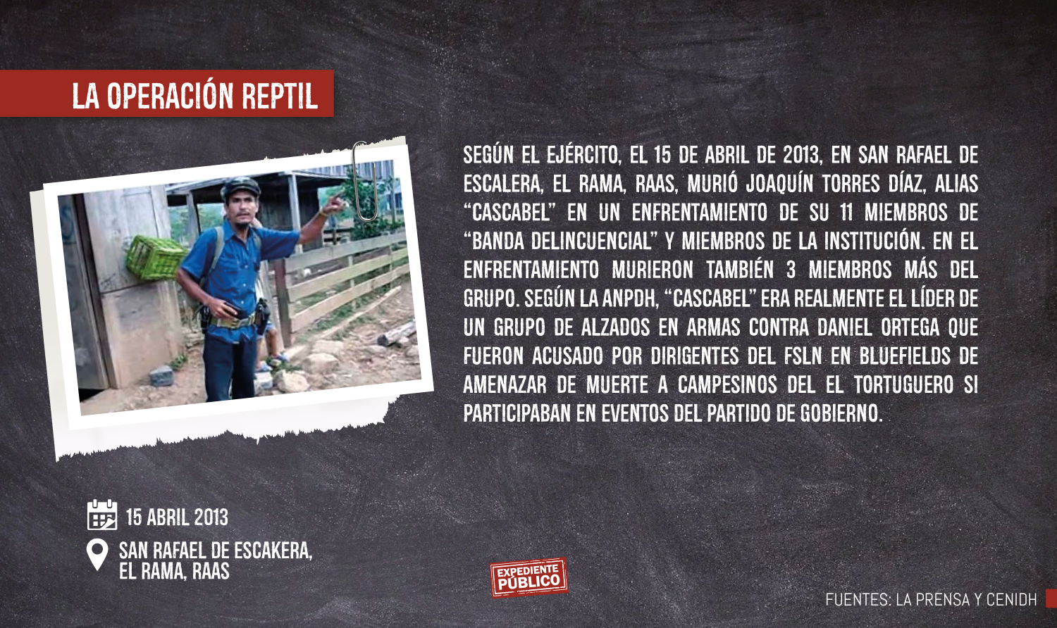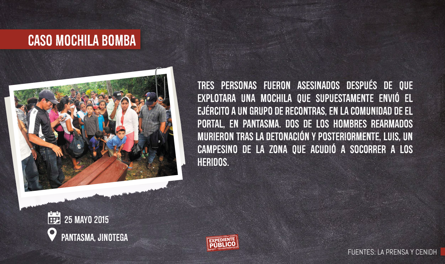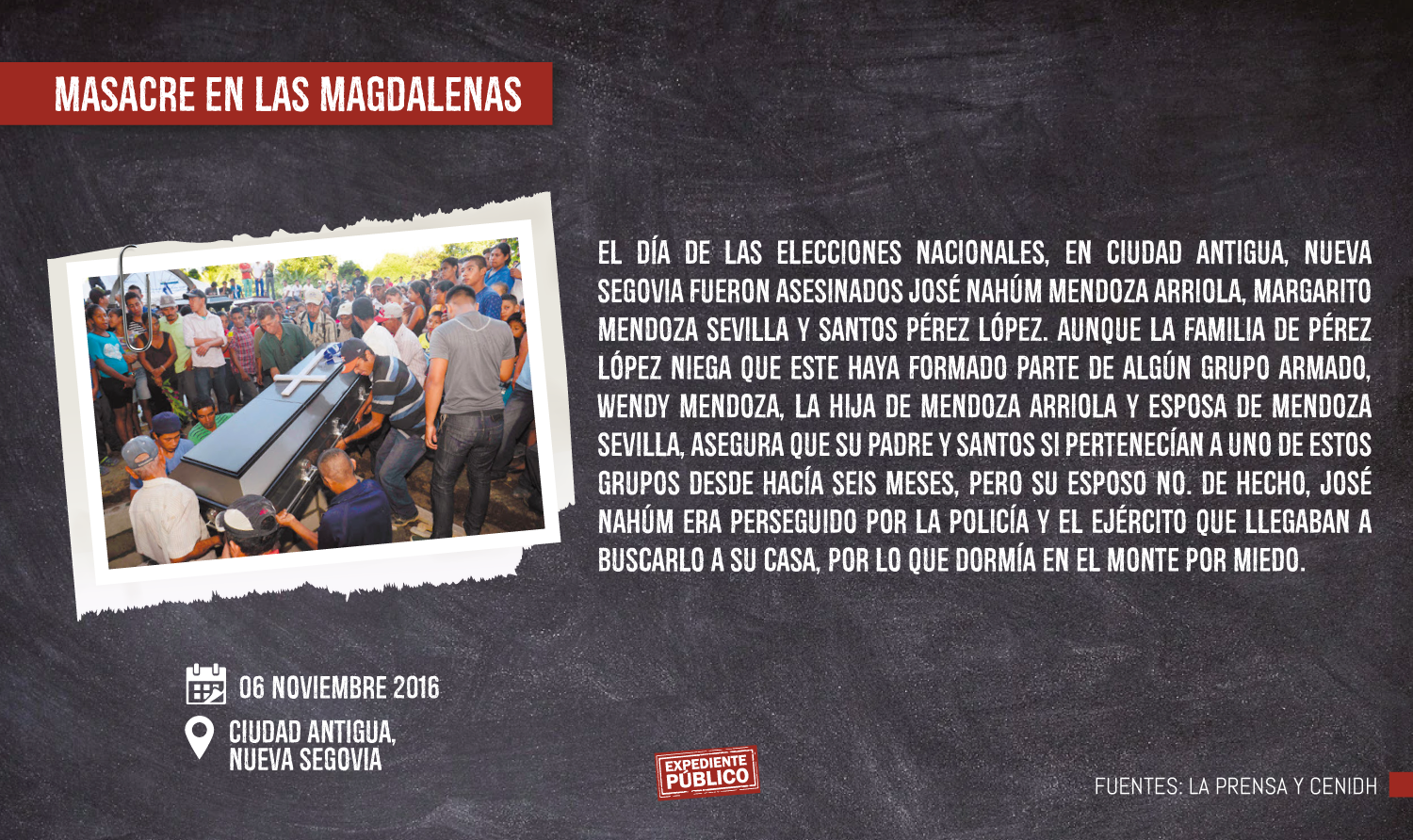 Muchos de ellos, según la investigación, habían manifestado (y había evidencia pública de ello), su condición de alzados en armas contra el gobierno sandinista, entre ellos figuran asesinatos colectivos: la mochila bomba del 25 de mayo de 2015 en Pantasma, donde murieron tres personas; la operación reptil de abril del 2013 en Wapí, contra Joaquín Torres Díaz, comandante Cascabel y tres de sus hombres alzados en armas, quienes fueron acribillados por el Ejército de Nicaragua; la masacre en Las Magdalenas, Ciudad Antigua, donde fueron asesinados José Nahum Mendoza, Margarito Mendoza y Santos Pérez López.