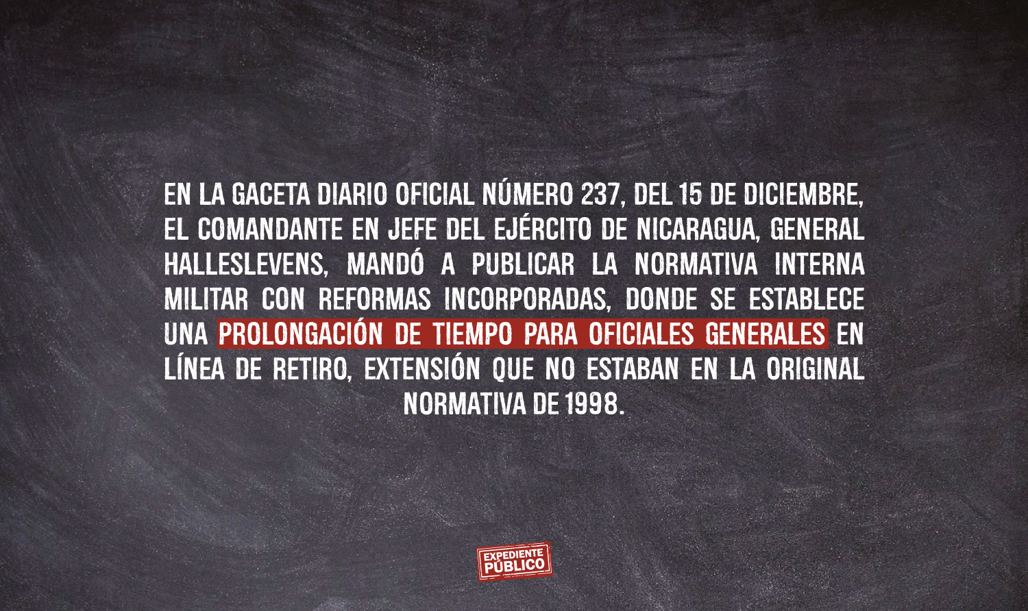 El general de Ejército Omar Halleslevens (2005 al 2010) convirtió la “propuesta” de Ortega en realidad y reformó la Normativa Interna Militar.