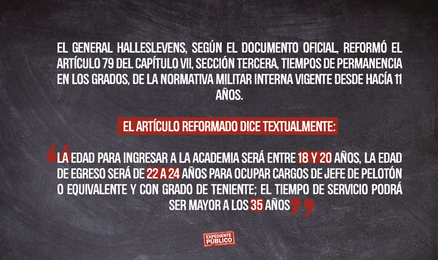 Vista la normativa original y la reforma realizada por el general Halleslevens, se observan dos cosas: el tiempo de servicio de los oficiales pasa de 30 a 35 años y se agrega la posibilidad de permanencia indefinida en los cargos con la incorporación de la siguiente norma: “En el caso de los Oficiales Generales el tiempo de servicio podrá ser mayor a los 35 años”.