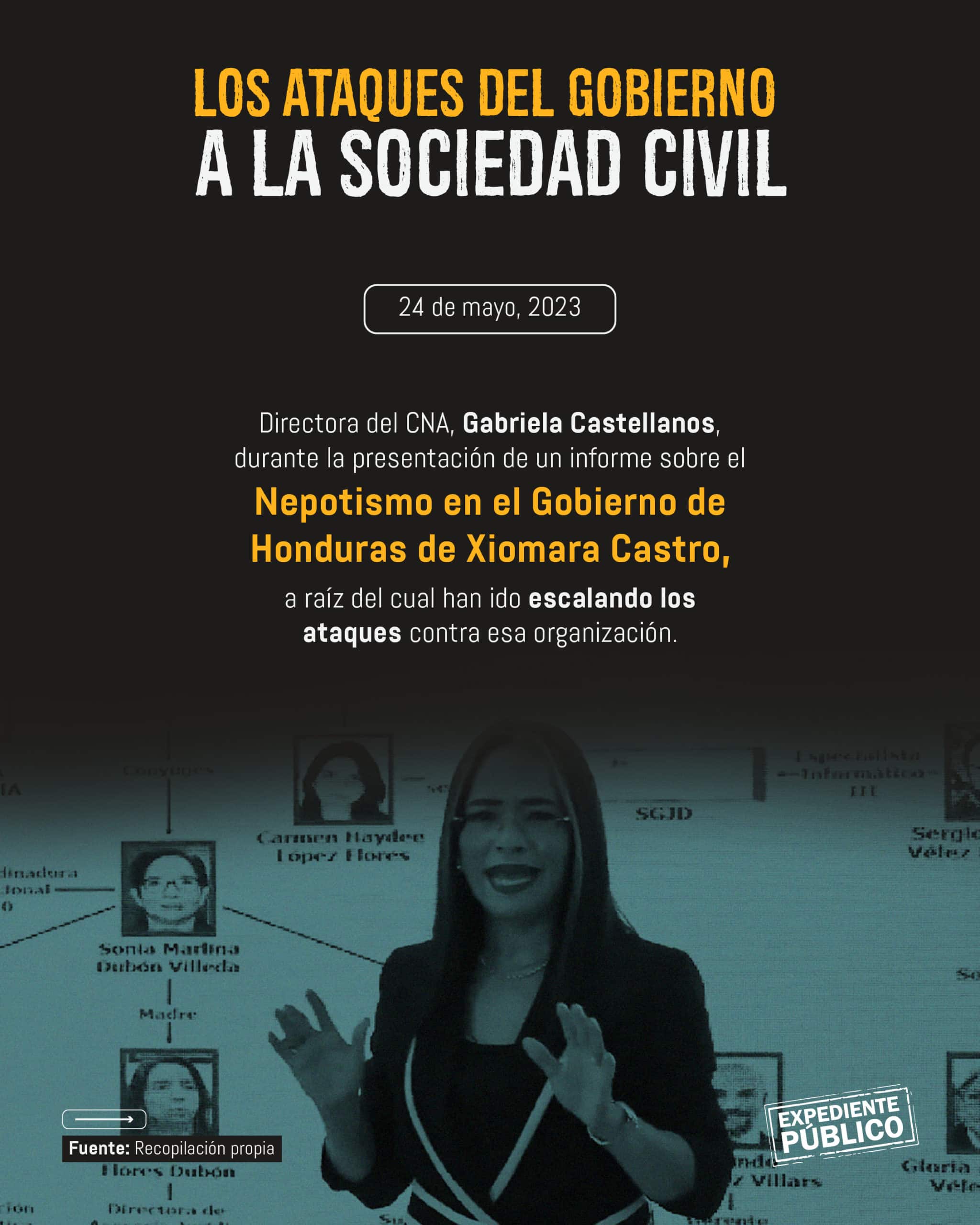 La arremetida más reciente del Gobierno de Castro ha tenido como objetivo al Consejo Nacional Anticorrupción (CNA), después que su directora Gabriela Castellanos dio una conferencia de prensa el 20 de julio de 2023 en la que manifestó que “nuestro regreso es para ver a los corruptos en la cárcel”.