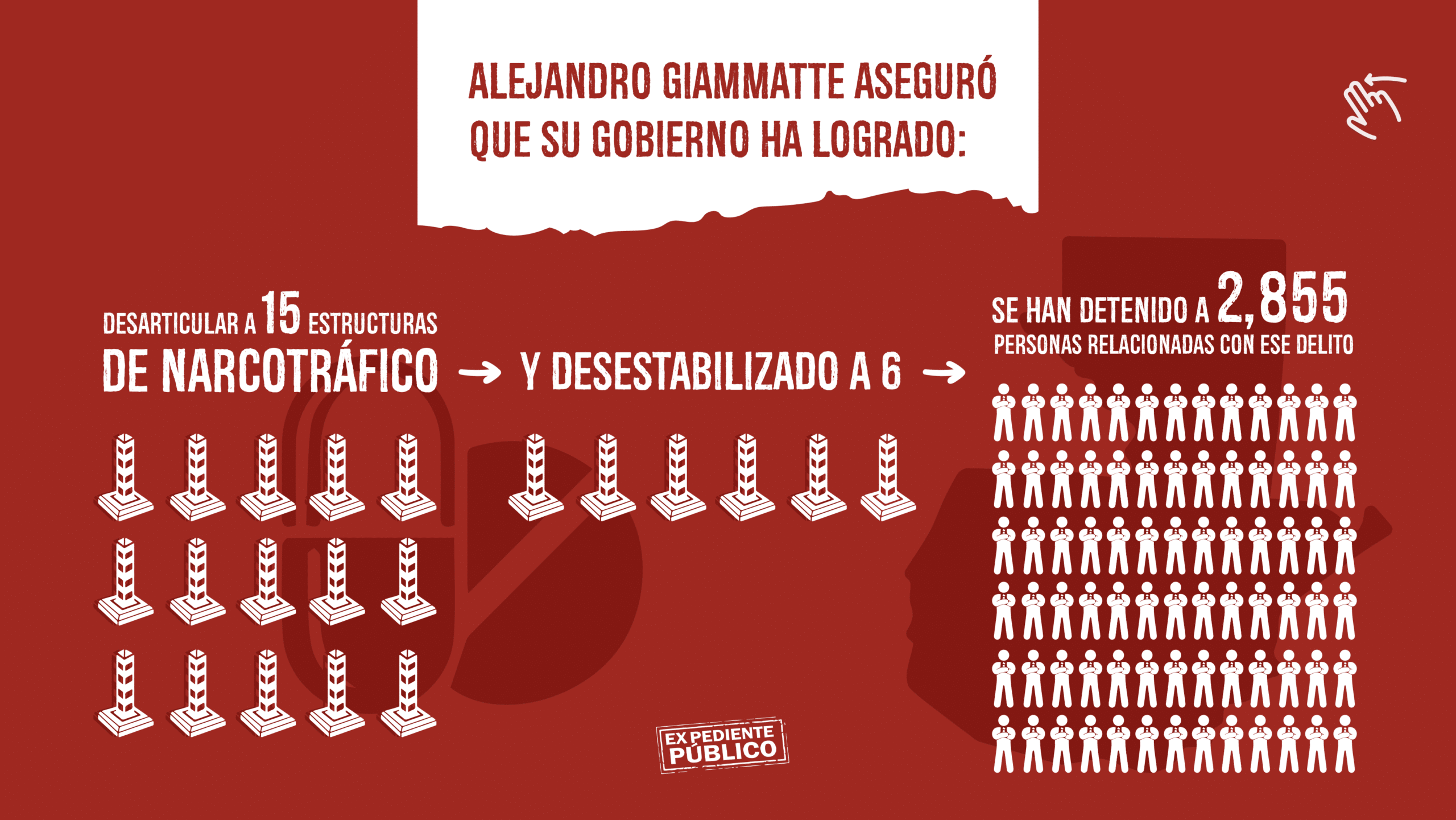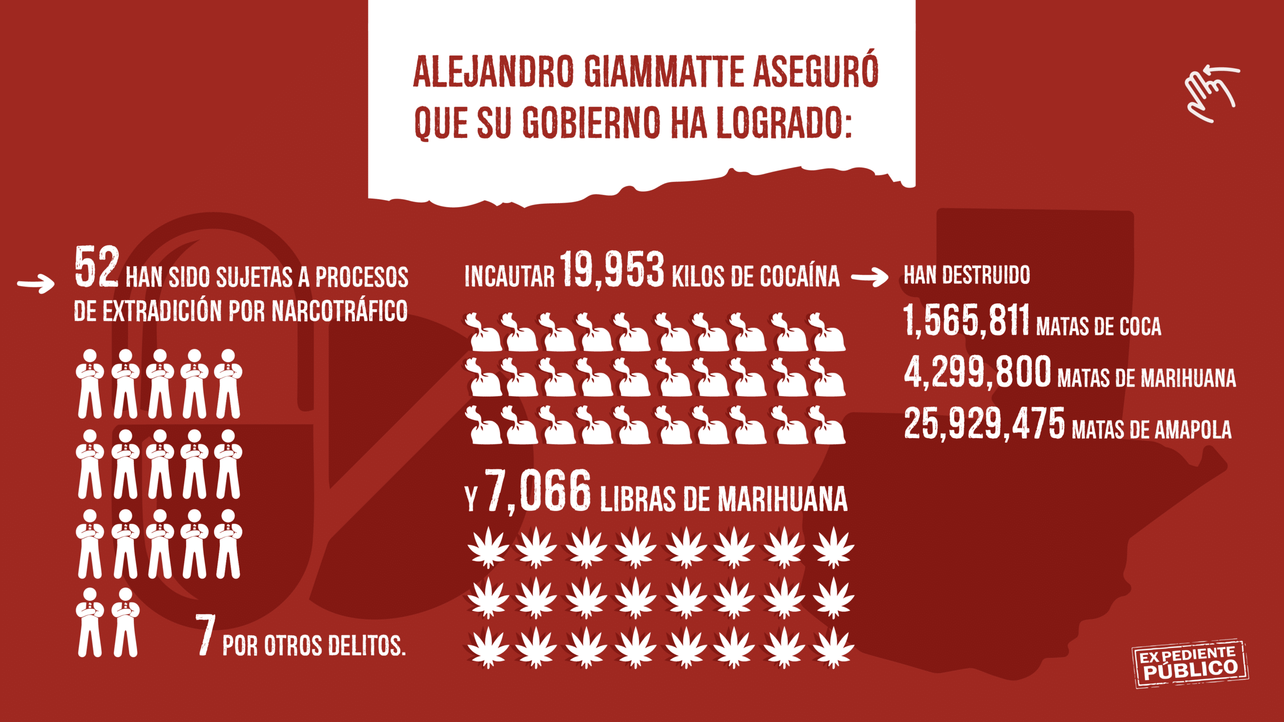 Giammattei aseguró que su gobierno ha incautado 19,953 kilos de cocaína y 7,066 libras de marihuana, además, han destruido 1,565,811 matas de coca; 4,299,800 matas de marihuana y 25,929,475 matas de amapola.