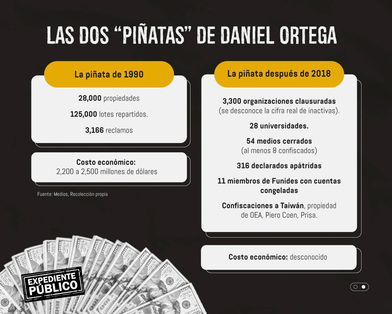 La confiscación a los 316 desnacionalizados, el cierre de más de 3,300 organizaciones, 28 universidades o fundaciones de educación superior, el cierre de medios, así como tomas de propiedad, plantearían un reto a un futuro Gobierno de transición porque se repite lo ocurrido en 1990.