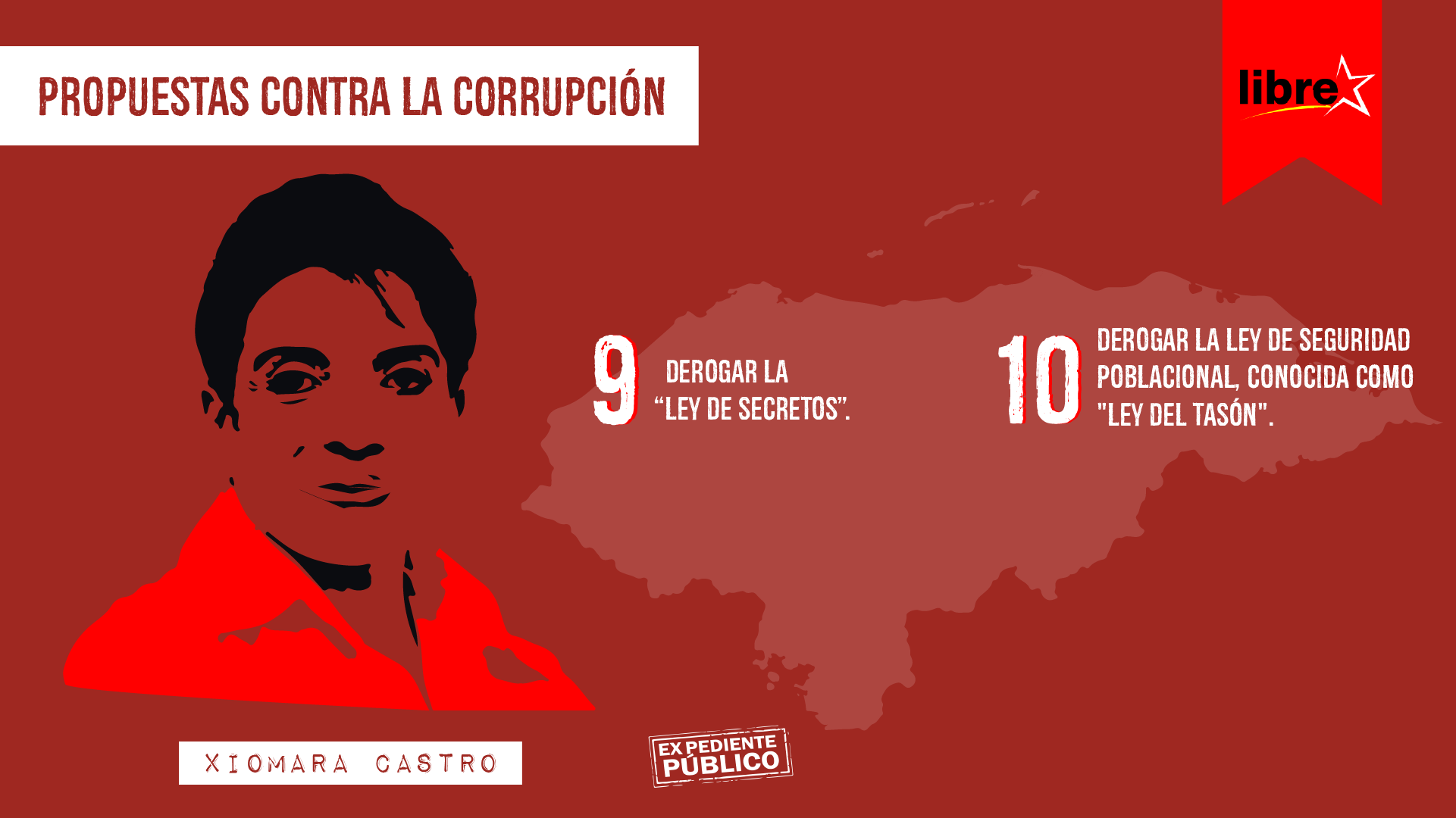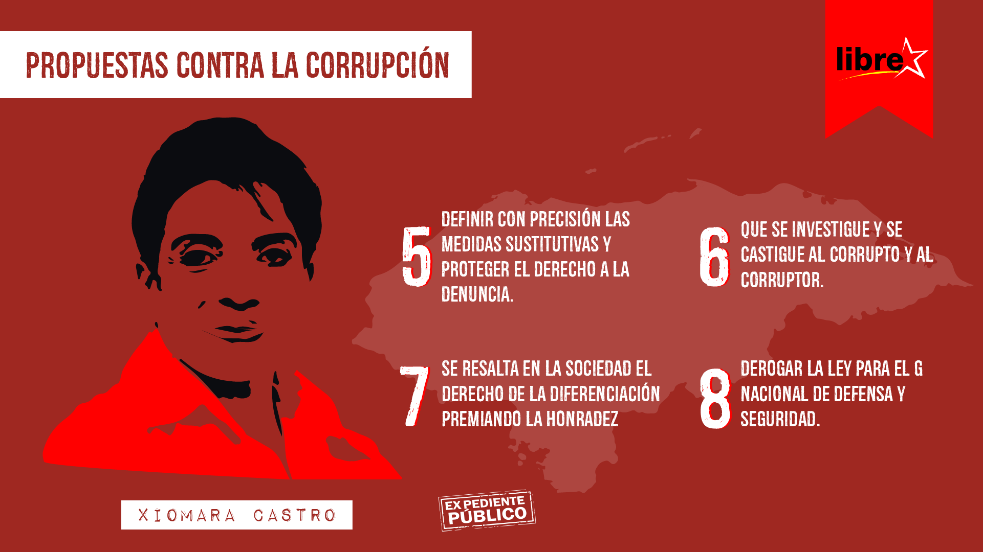 De igual manera, Libre promete que distinguirá al ciudadano u operador de justicia ejemplar y a toda persona que condene con vehemencia al delito. Asimismo, que se investigarán y castigarán al corrupto y corruptor.