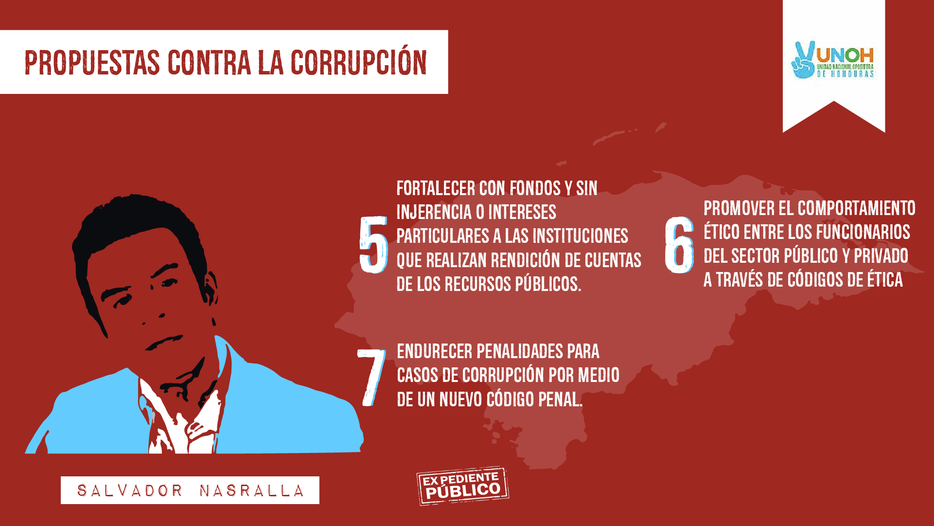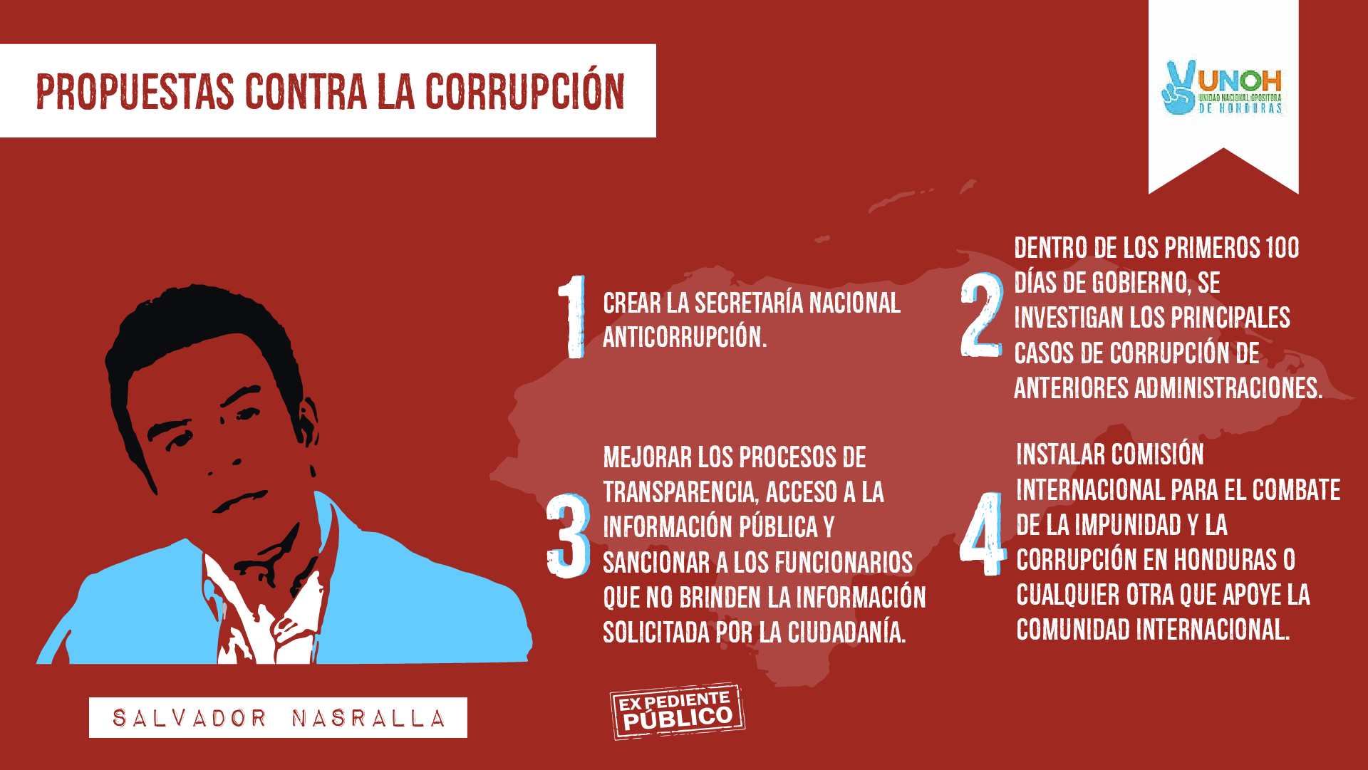 De lado de la UNOH, el presidenciable Salvador Nasralla, expuso en una transmisión en Facebook que creará la Secretaría Nacional Anticorrupción como entidad bandera para el ataque a este problema.