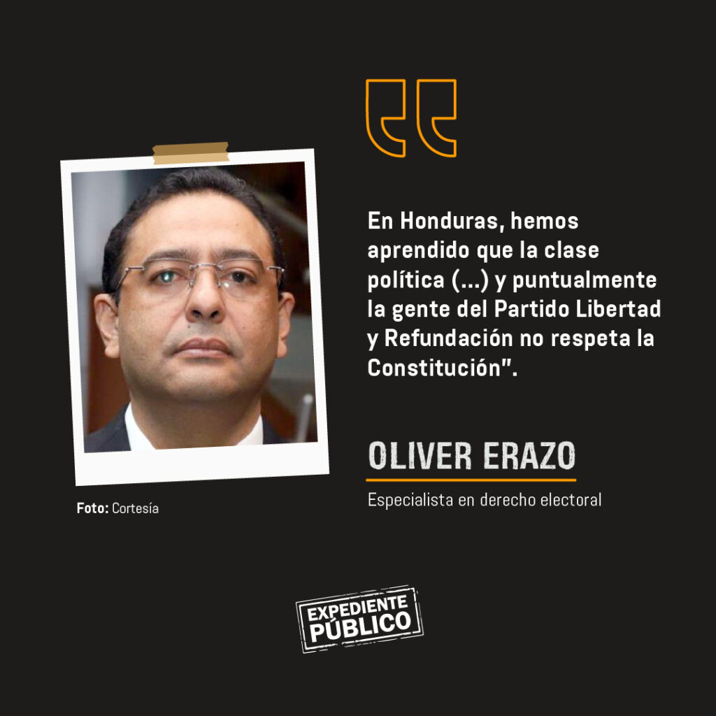 “Conforme a la ley, está prohibido que esa conducta suceda. No lo pueden hacer ninguno de los candidatos, pero en Honduras hemos aprendido que la clase política y los políticos en específico y puntualmente la gente del Partido Libertad y Refundación no respeta la Constitución y no respeta la ley”, expresó Erazo.