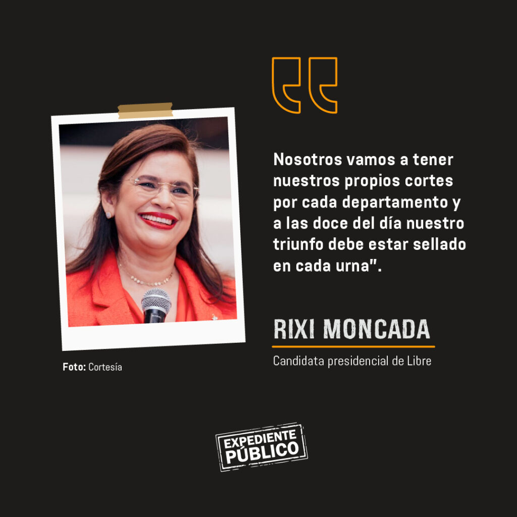 “Nosotros vamos a tener nuestros propios cortes por cada departamento y a las doce del día nuestro triunfo debe estar sellado en cada urna, por eso el Consejo Nacional Electoral (CNE) no tendrá otra opción que salir a las nueve de la noche a decir que la proyección a nivel nacional da por ganadora a la candidata Rixi Moncada”, expresó la candidata de Libre.