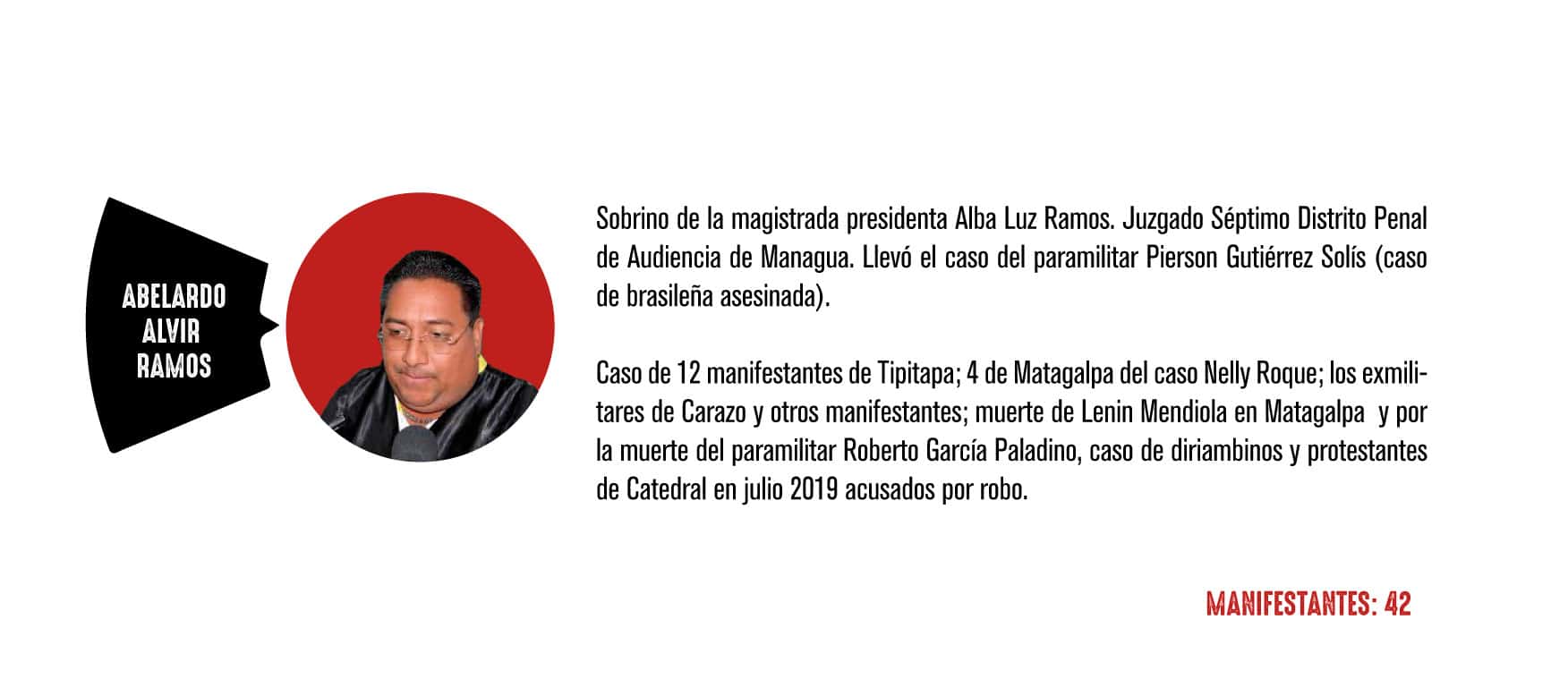 En cuanto a Abelardo Antonio Alvir Ramos, sobrino de Alba Luz Ramos, este llevó el caso de Pierson Gutiérrez Solís, el paramilitar que mató a una estudiante brasileña, y liberado el 23 de julio bajo la polémica Ley de Amnistía.
