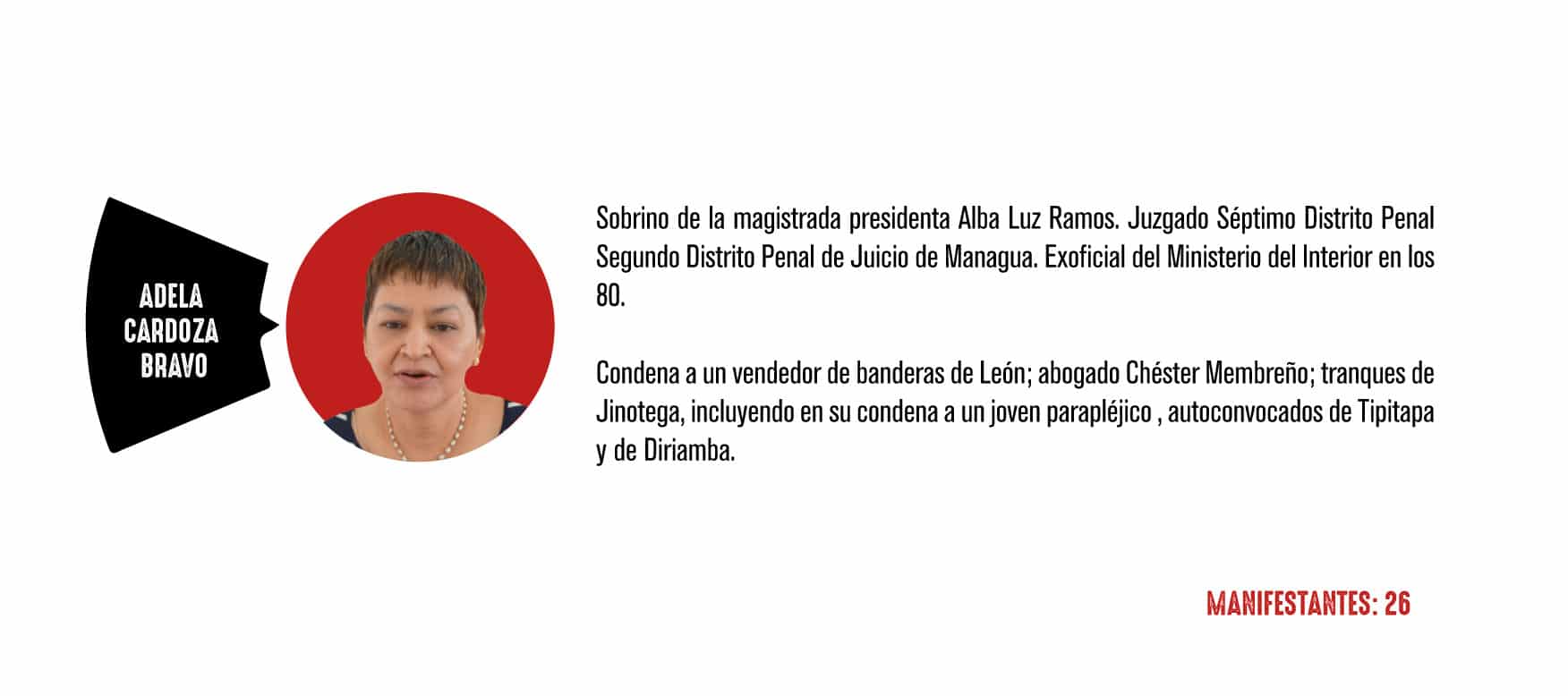 Adela Cardoza Bravo, exmilitar y titular del Juzgado Segundo Distrito Penal de Juicio, fue quien condenó a cinco años y nueves meses de prisión más el pago de una multa de C$4,679.25, a Luis Enrique Cuevas Poveda, quien se ganaba la vida vendiendo banderas de Nicaragua en las marchas opositoras de León.