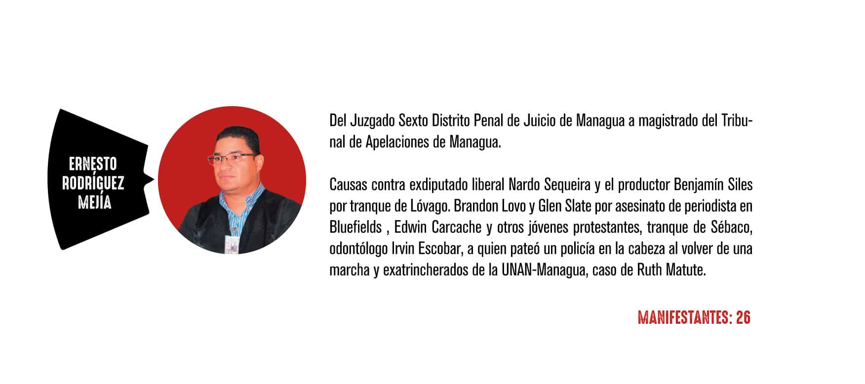 En cambio, Ernesto Rodríguez Mejía, el judicial que condenó a Lovo y Glen Slate por el crimen del reportero, fue nombrado después magistrado de la Sala Civil Uno del Tribunal de Apelaciones de Managua.