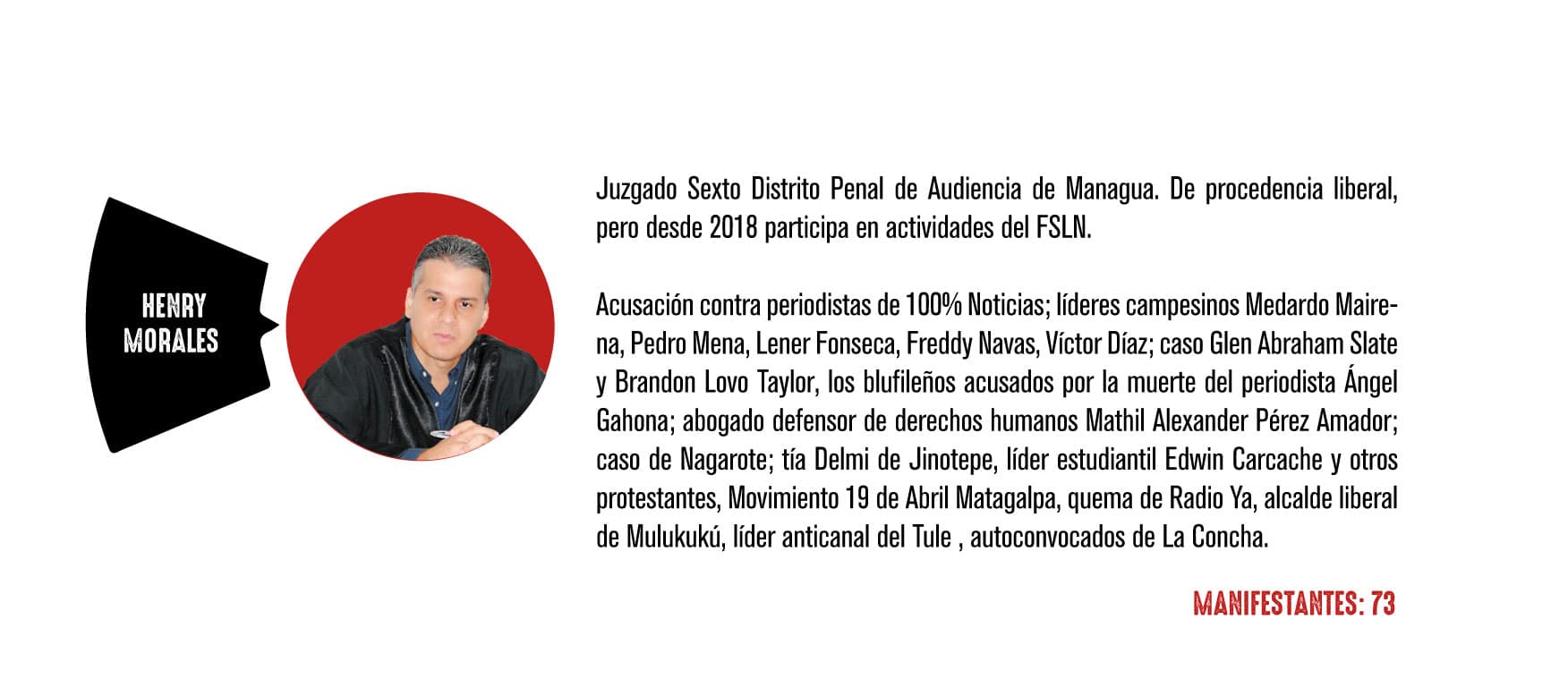 Henry Morales, Sexto Distrito Penal de Audiencia de Managua, inició los juicios contra los periodistas de 100% Noticias, los líderes campesinos, los bluefileños acusados por la muerte del periodista Ángel Gahona, también tuvo el caso de fraude de Álvaro Montealegre, hermano de Eduardo Montealegre, a quien reabrió en 2016 un juicio por el caso de los Cenis.