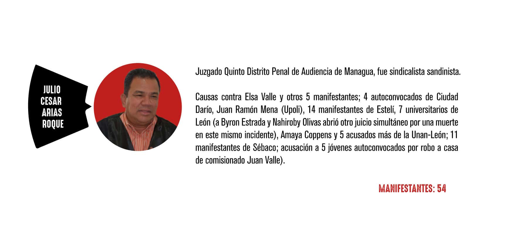 Julio César Arias Roque, quien llevó el juicio de Elsa Valle y otros cinco manifestantes, el caso de Olesia Muñoz, así como el de cuatro autoconvocados de Ciudad Darío, llegó en abril de 1999 al sistema judicial como suplente del Juzgado Cuarto de Distrito del Crimen de Managua y desde septiembre de 2006 ocupa el cargo titular del Quinto Distrito Penal de Audiencia.