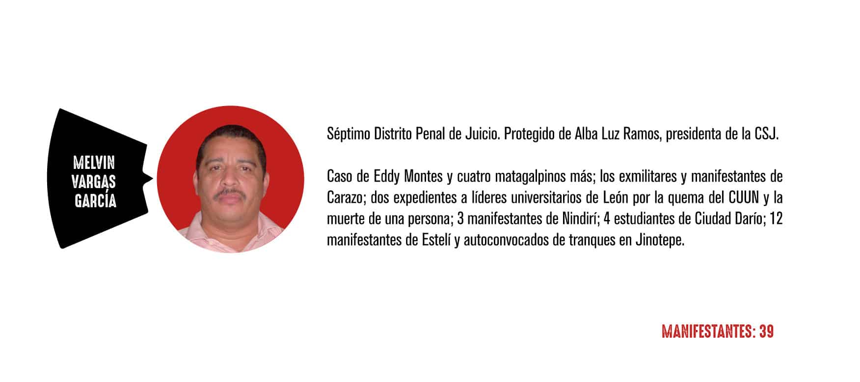 Melvin Vargas García, muy protegido por Alba Luz Ramos, pasó del juzgado de ejecución de sentencia a ser juez Séptimo Distrito Penal de Juicio, en sustitución de Octavio Rothschuh que pasa a ser magistrado de las Sala Penal Uno del Tribunal de Apelaciones de Managua, el 27 de febrero de 2018.