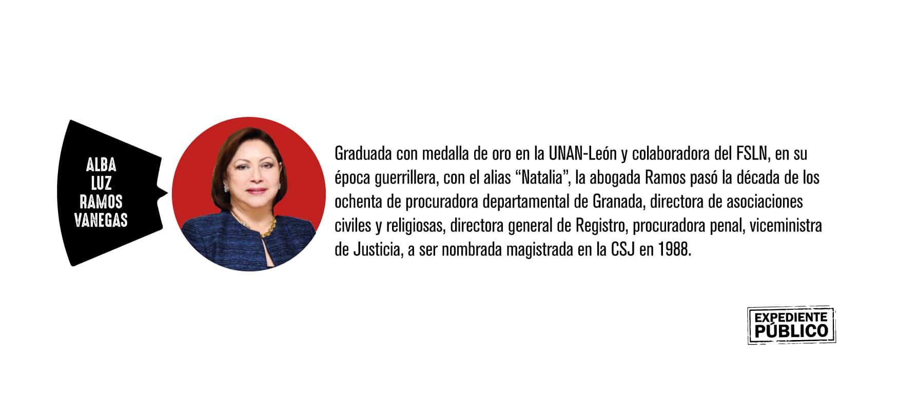 El Consejo está integrado por Ramos Vanegas, presidenta de la CSJ; Marvin Aguilar García, vicepresidente; Juana Méndez Pérez y Virgilio Gurdián Castellón. Los tres primeros son de tendencia sandinista y el último no fue reconocido por el Partido Liberal Independiente (PLI), fracción de Eduardo Montealegre, banquero, excanciller, exministro de Hacienda, exsecretario de la Presidencia, exdiputado, excandidato a la Alcaldía de Managua y la Presidencia.