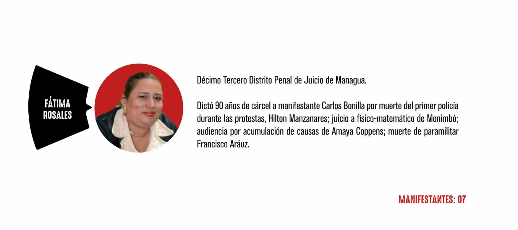 Fátima Rosales, Décimo Tercero Distrito Penal de Juicio, mantuvo el caso de la quema del Centro Universitario de la Universidad Nacional Autónoma de León, y la acusación por terrorismo contra Amaya Coppens, entre otros líderes estudiantiles, condenó a 90 años a Carlos Alberto Bonilla López, por la muerte del antimotín Hilton Rafael Manzanares y el asesinato frustrado contra otros cuatro policías.