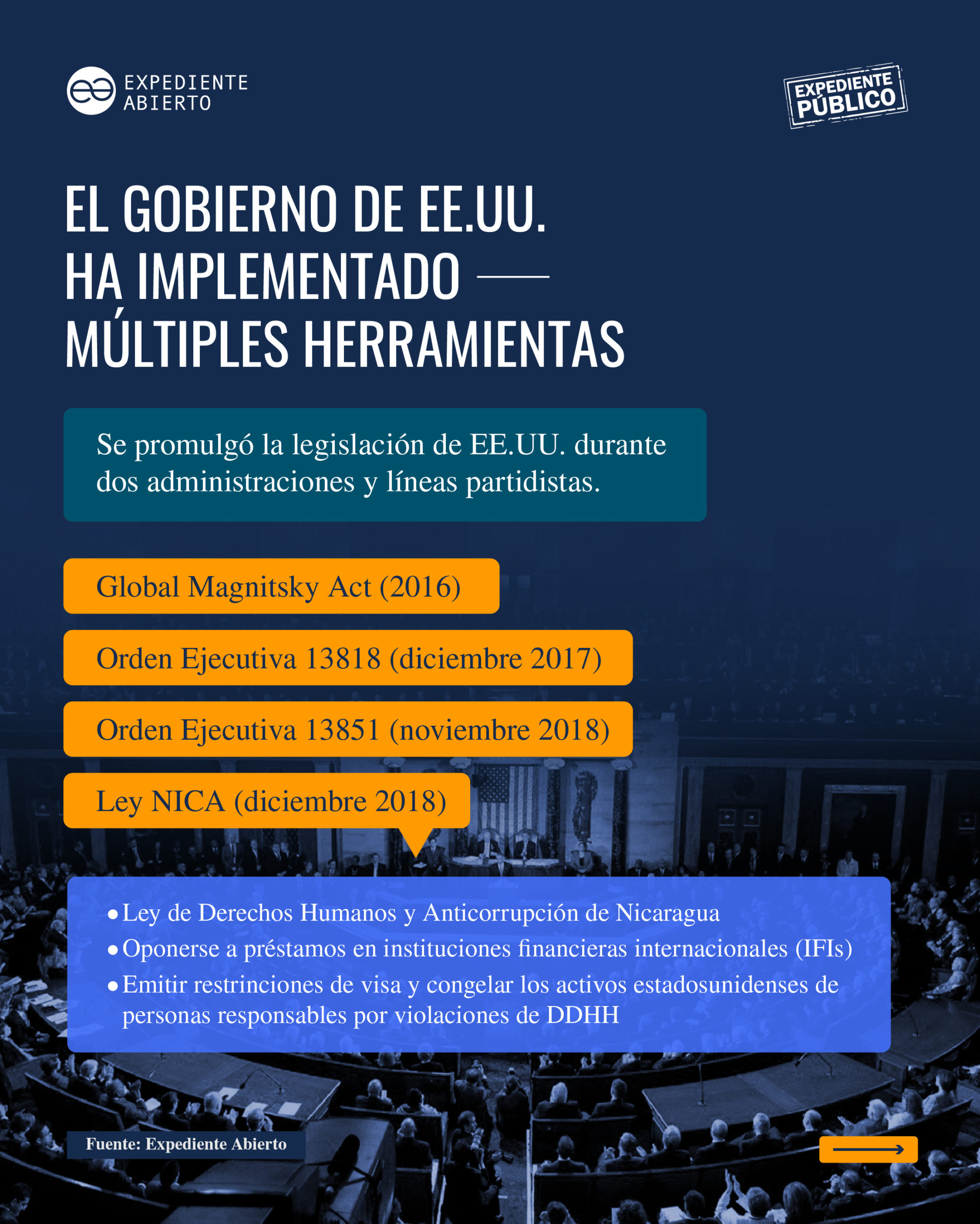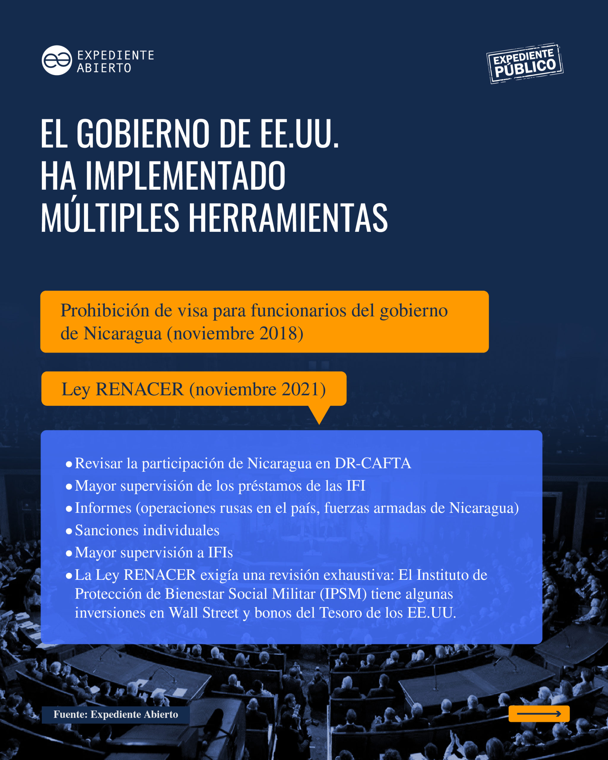A finales de 2018, el Congreso de Estados Unidos aprobó la “Nica Act” como herramienta para imponer sanciones a altos funcionarios nicaragüenses y otros implicados en violaciones de derechos humanos y condiciona los préstamos de organismos internacionales a Nicaragua.
