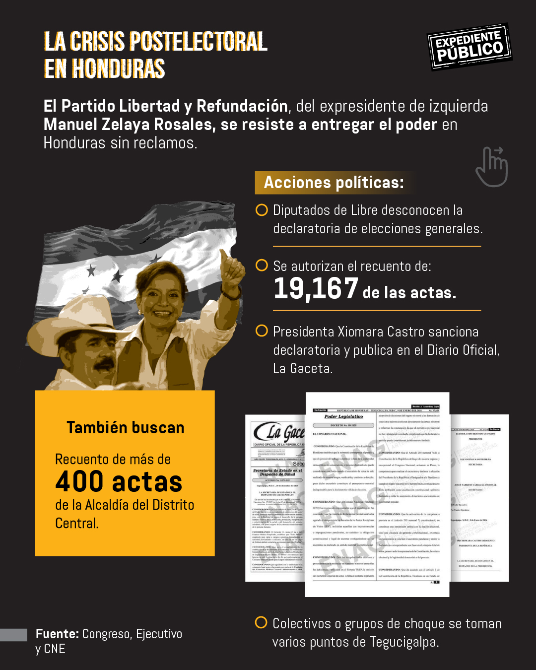 La mandataria no ocultó su molestia. De entrada, calificó a la nueva administración, que iniciará funciones el próximo 27 de enero, como un “gobierno de facto”. Con este mensaje, Libre monta una nueva narrativa de oposición.