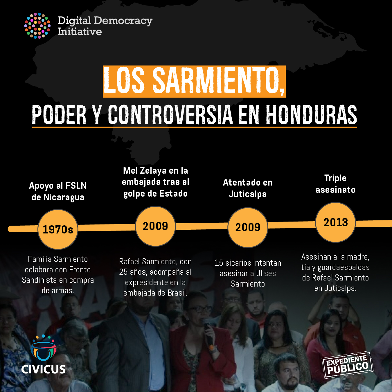 “En los doce años de dictadura perdimos vidas valiosas”, ha señalado públicamente Rafael Sarmiento, en referencia a los tres gobiernos nacionalistas entre 2010 y 2022. Además de su madre, en 2019 fueron asesinados dos de sus primos, hijos de Eduardo «Lalo» Sarmiento, otro de los patriarcas de la familia, quien fue diputado por el Partido Nacional tanto en el Parlamento Centroamericano (Parlacen) como en el Congreso Nacional.