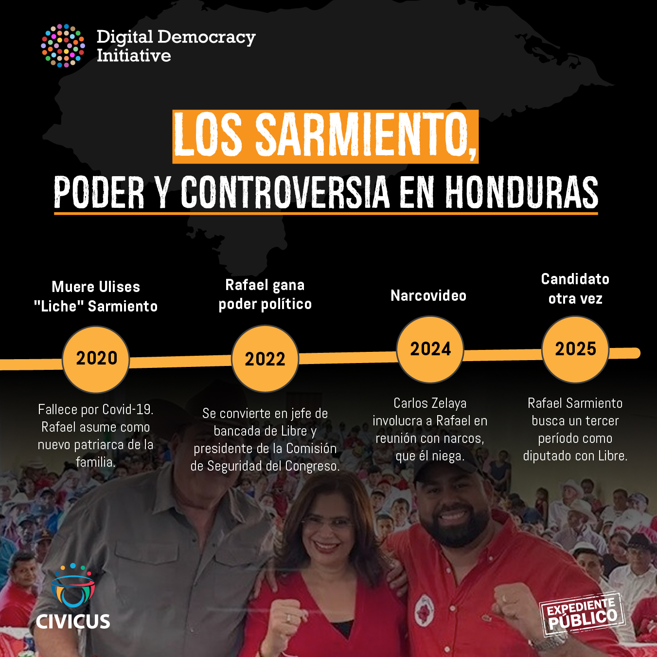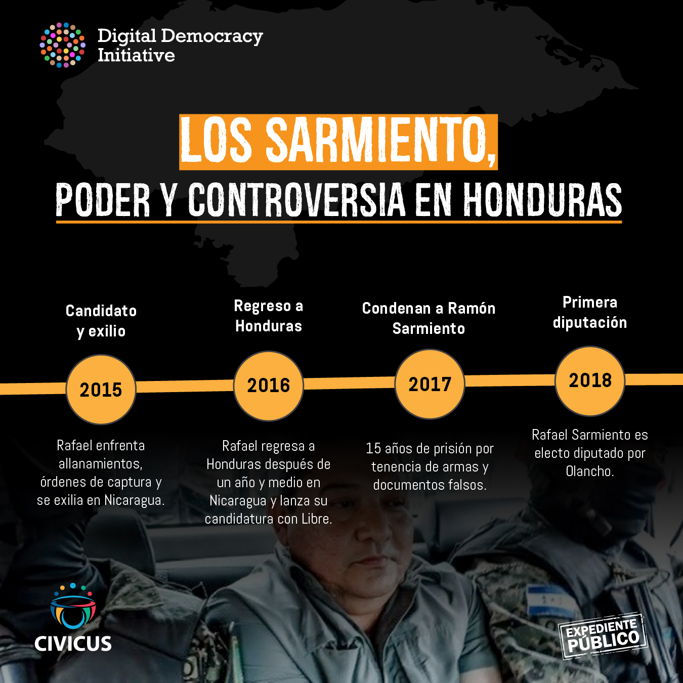 En mayo de 2015, apenas dos días después de que Rafael Sarmiento anunciara su candidatura a la diputación de Olancho por el partido Libre, una operación conjunta entre la Policía Nacional y las Fuerzas Armadas, compuesta por 400 agentes, llevó a cabo un allanamiento en varias propiedades de la familia Sarmiento.