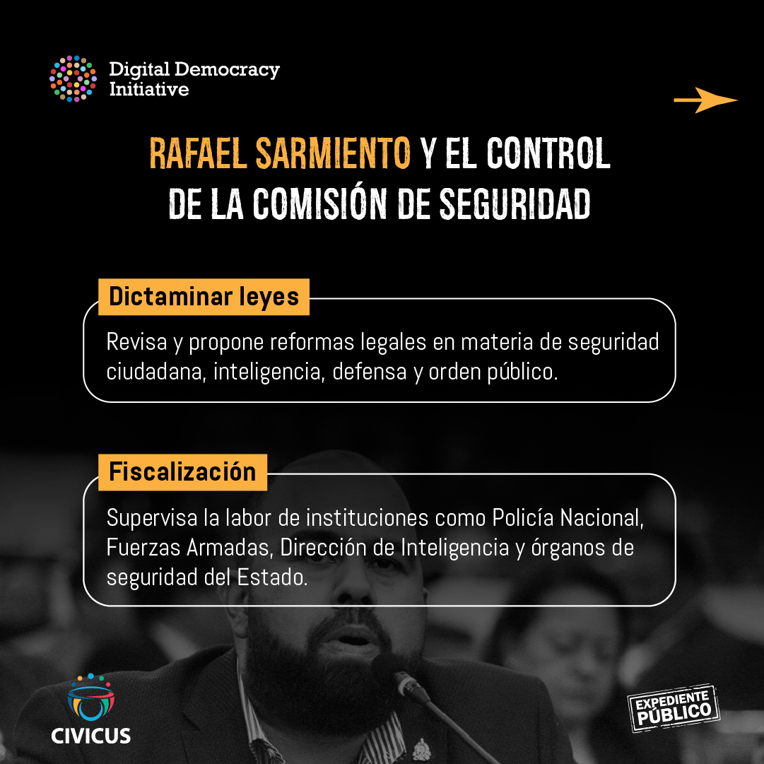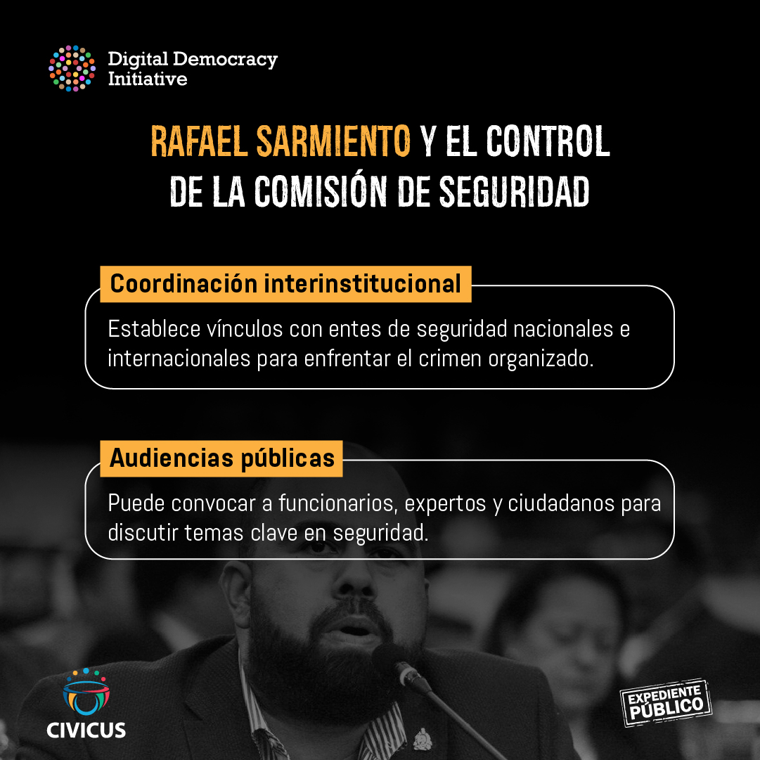 A pesar del distanciamiento con los Zelaya, Rafael Sarmiento aún preside la Comisión de Seguridad. Desde ahí dirige la discusión sobre la narcoactividad, el crimen organizado, el uso de tecnología de vigilancia, la militarización territorial, el presupuesto de seguridad y defensa, las reformas a la Policía Nacional o de la Ley de Portación de Armas, entre otros temas. Así, ese joven abogado que acompañó a Manuel Zelaya en la embajada de Brasil se convirtió en uno de los actores más influyentes de la vida nacional.