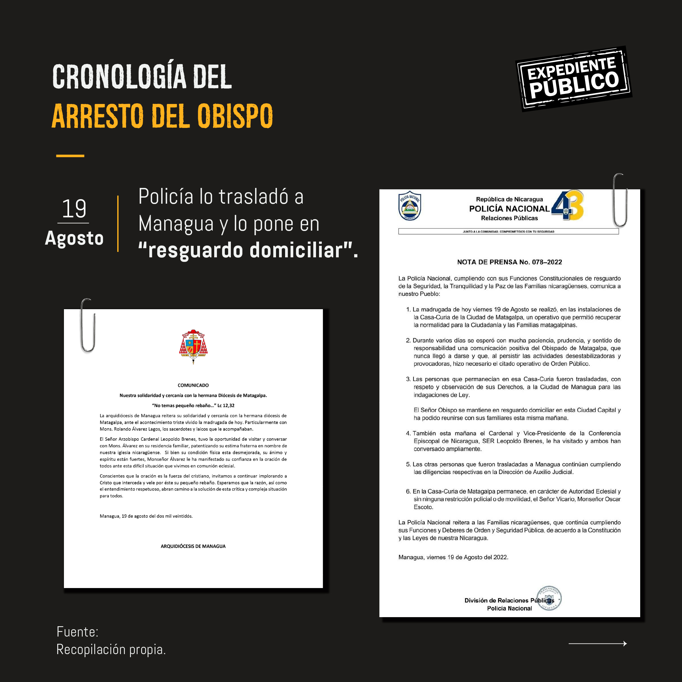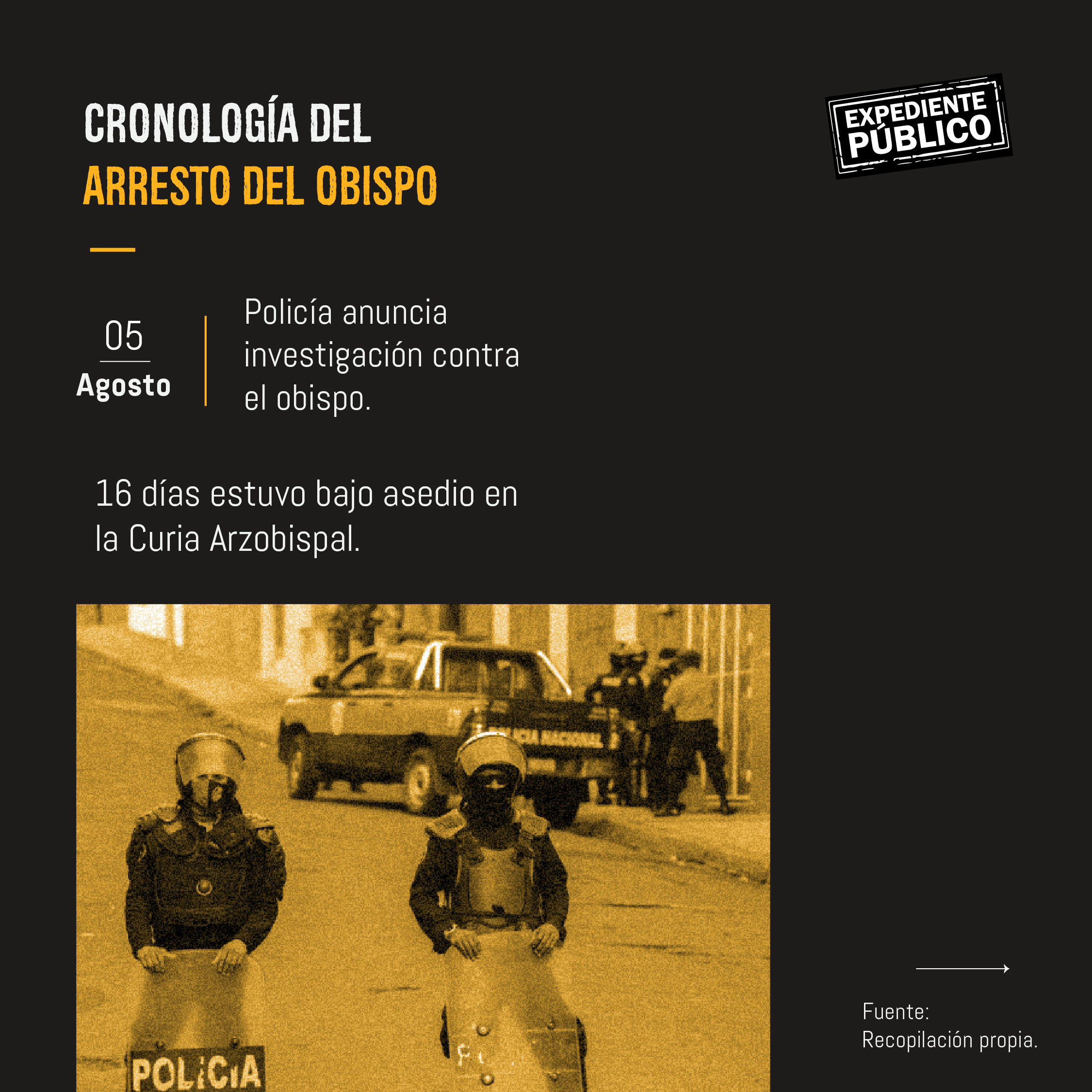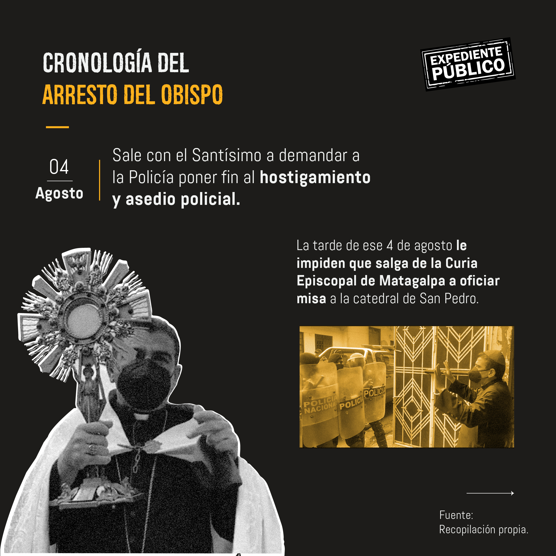 Las imputaciones policiales se dieron un día después que el jerarca de la Iglesia católica salió de la Curia Arzobispal de Matagalpa con el Santísimo en sus manos para demandar a la Policía Nacional poner fin al hostigamiento y asedio policial que estaba sufriendo desde que denunció el cierre de ocho radioemisoras católicas.
