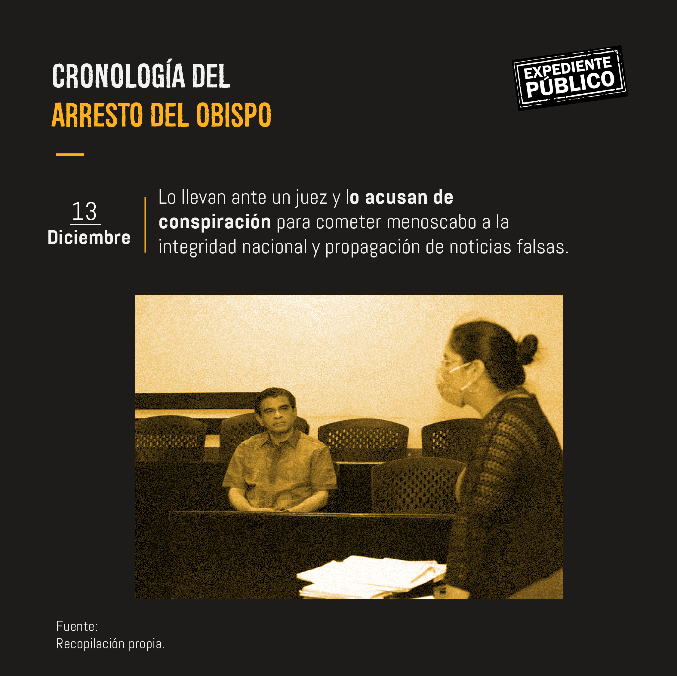 El 13 de diciembre de 2022, la judicial admitió la acusación que presentó el fiscal Manuel Rugama contra el obispo Álvarez, se le nombró un defensor de oficio, le decretó arresto domiciliario y programó audiencia inicial para el 10 de enero, según informó entonces la Dirección de Prensa y Relaciones Públicas del Complejo Judicial Central Managua.