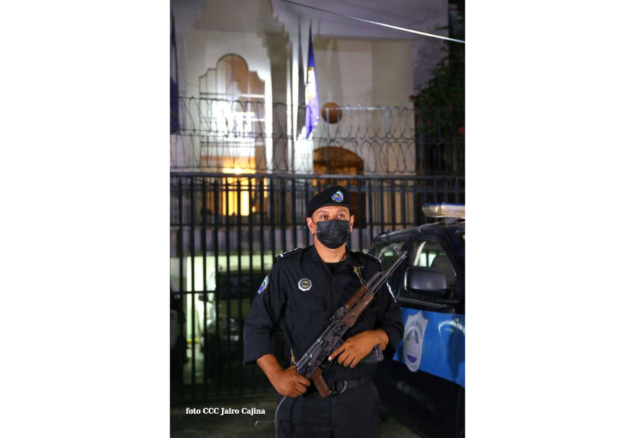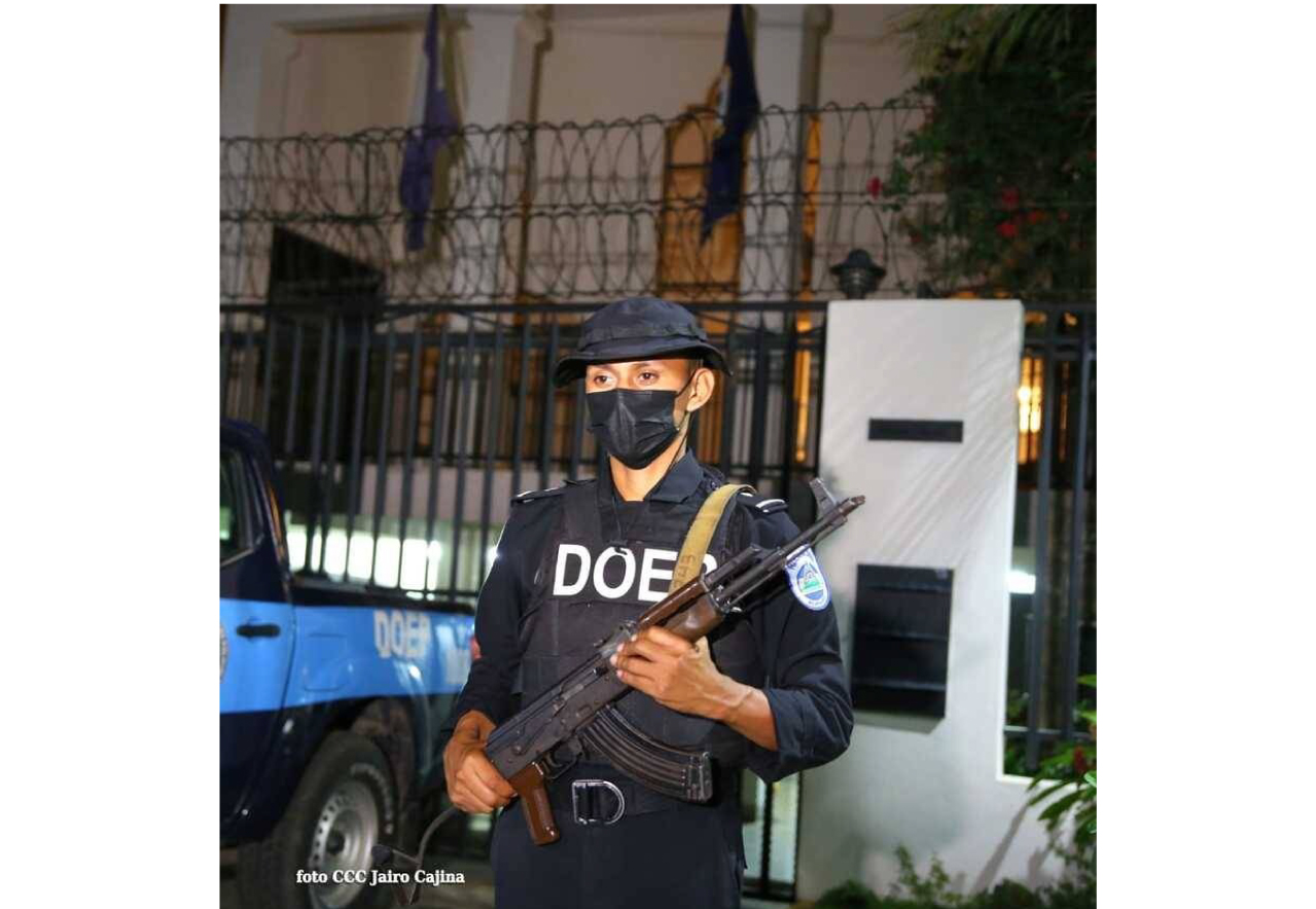 Los medios oficiales difundieron también imágenes del bloqueo con policías y patrullas de la entrada de las instalaciones de la sede de la OEA en Managua.