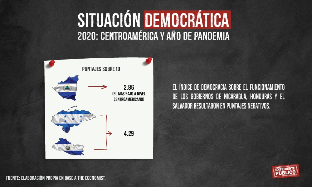 Sin embargo, pese a la clasificación híbrida en el indicador global, a juicio de Lara. «Nicaragua es el único país en Centroamérica al que ya no podemos clasificar como democracia, esto tiene que ver con el ascenso de Daniel Ortega al poder y sus sucesivas reelecciones. Para las elecciones de 2021 llegamos a una situación complicada con tres leyes: la Ley del Ciberdelitos, Ley de Agentes Extranjeros y la Ley de Defensa de los Derechos del Pueblo a la Independencia, la Soberanía y Autodeterminación para la Paz…, son medidas que se están usando para que se llegue a las elecciones sin posibilidades reales de competencia y Ortega consolide su cuarto mandato», indicó.