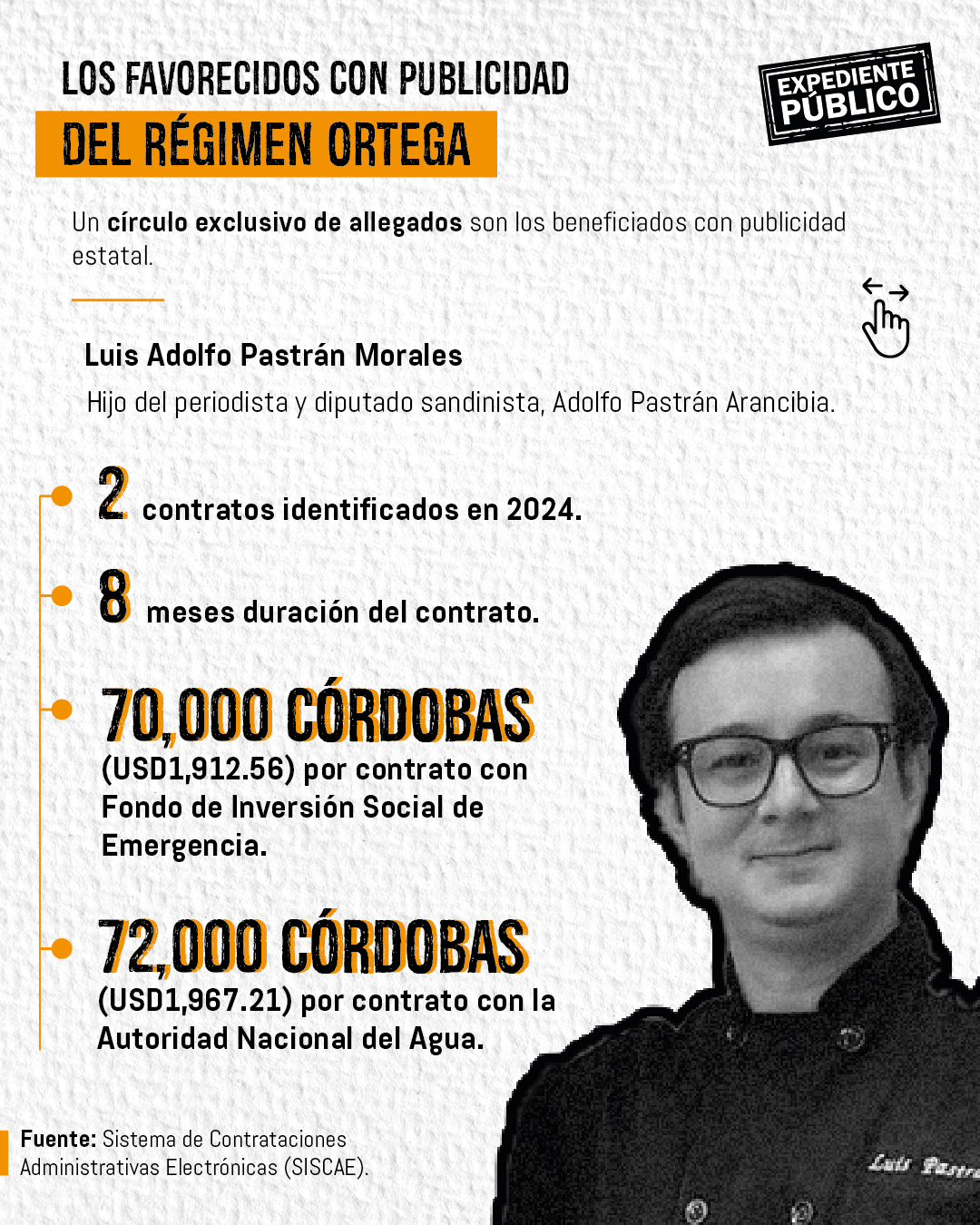 Otra figura clave que se beneficia de los contratos estatales es Luis Adolfo Pastrán Morales —hijo del diputado sandinista y periodista Adolfo Pastrán Arancibia— quien obtuvo dos contratos en 2024 que suman 142,000 córdobas (unos USD3,879.78).