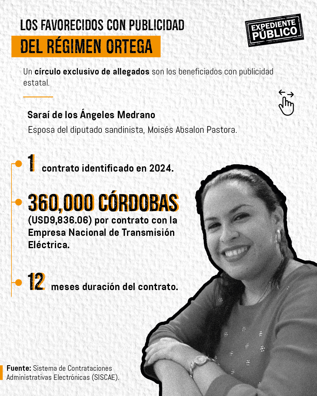 Saraí de los Ángeles Medrano Tenorio, esposa del diputado sandinista Moisés Absalón Pastora, consiguió en febrero un contrato de 12 meses por valor de 360,000 córdobas (unos USD9,836.06) de Enatrel.