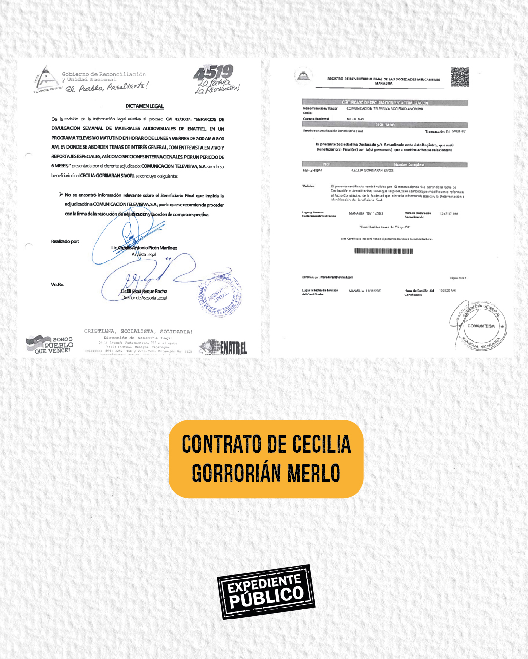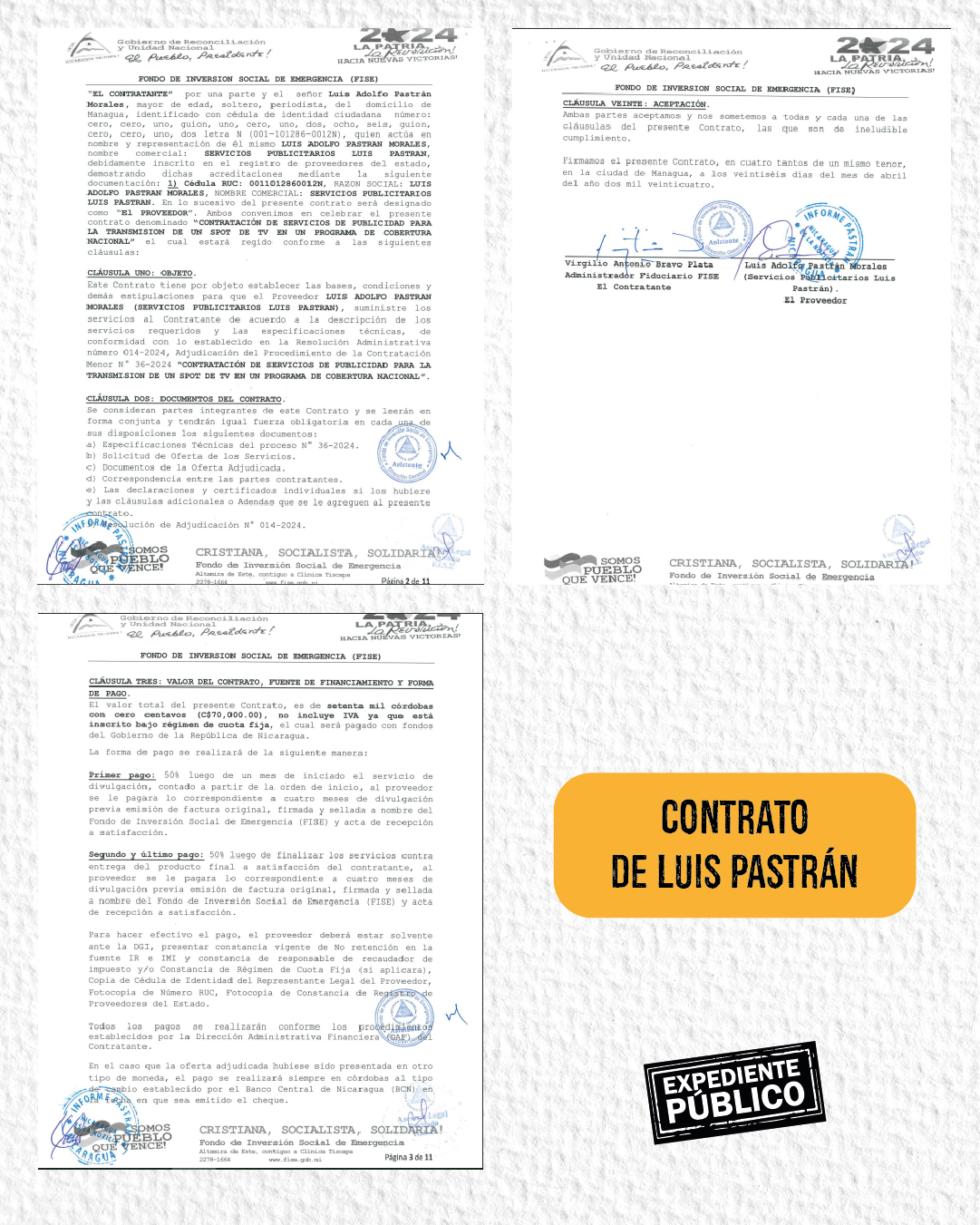 Incluso al firmar contratos, Pastrán Morales acompaña su rúbrica con un sello que dice: “Informe Pastrán: Nicaragua es la Noticia”, que hace referencia al medio de comunicación que su padre dirige desde hace más de una década.