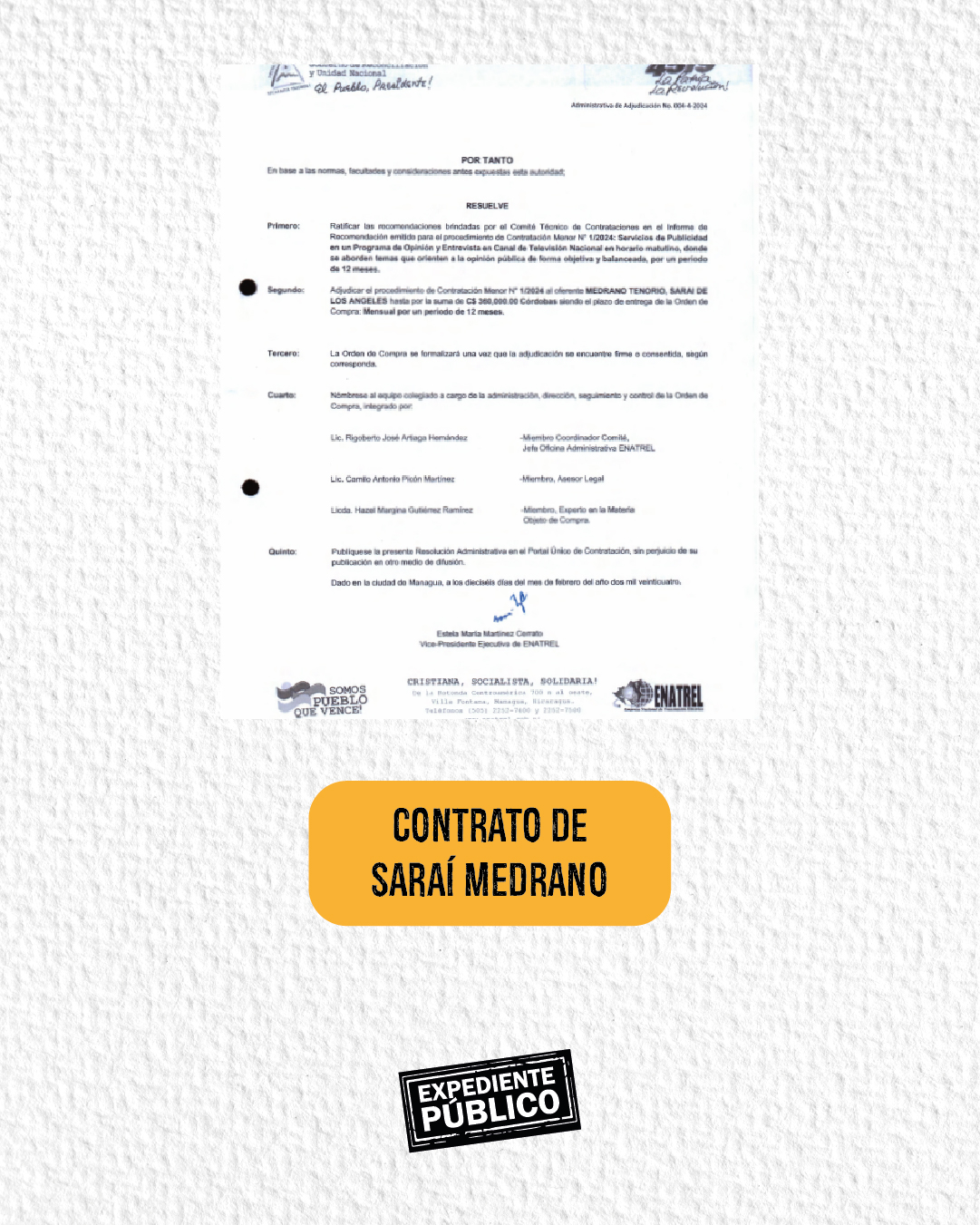 Además, hay otra lista de propagandistas del régimen que frecuentemente son beneficiados y que en este periodo recibieron contratos: William Palacios Martínez (72,000 córdobas), Alberto Carballo Madrigal (165,600 córdobas) y José León Quant (20,000 córdobas).