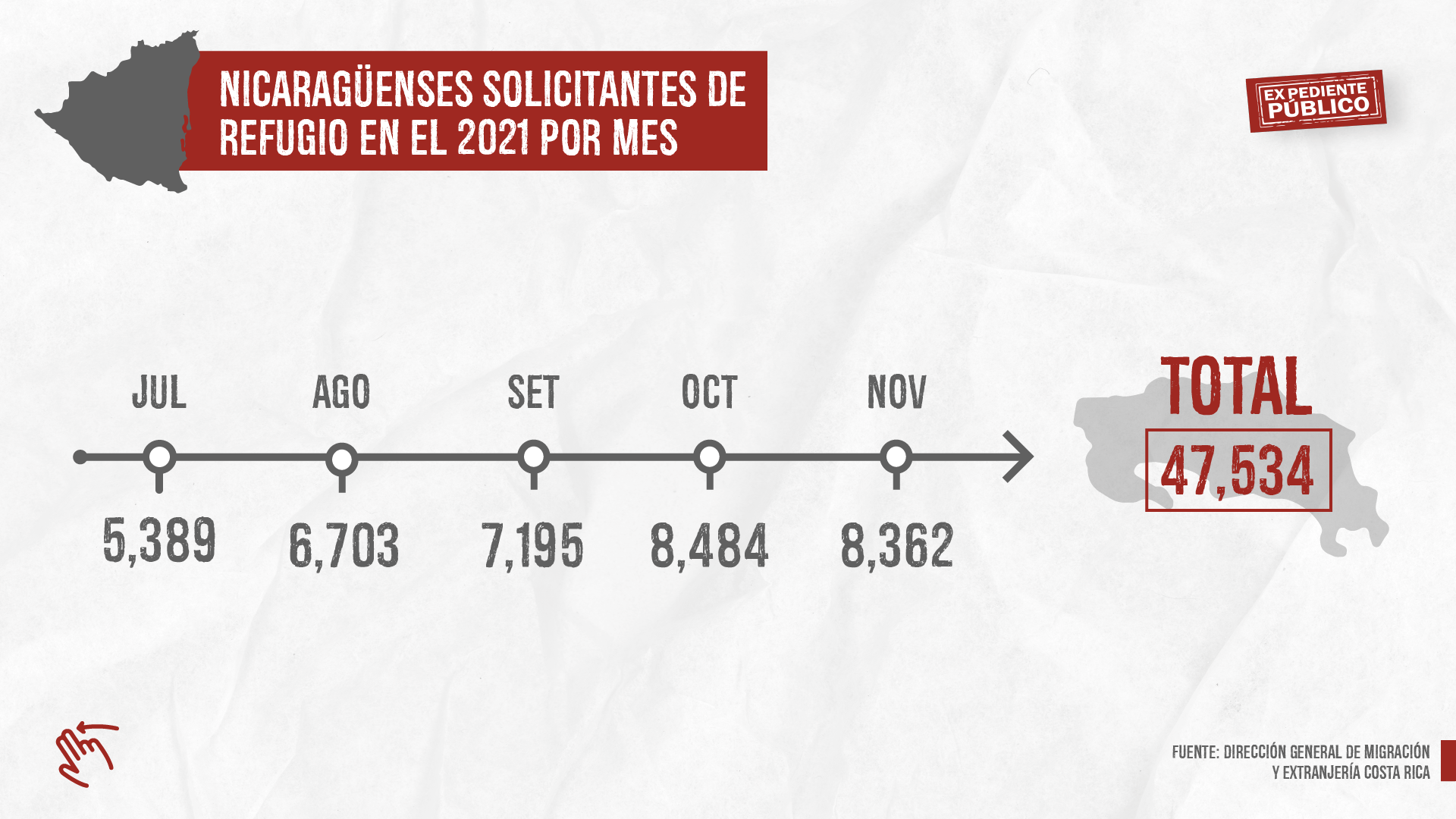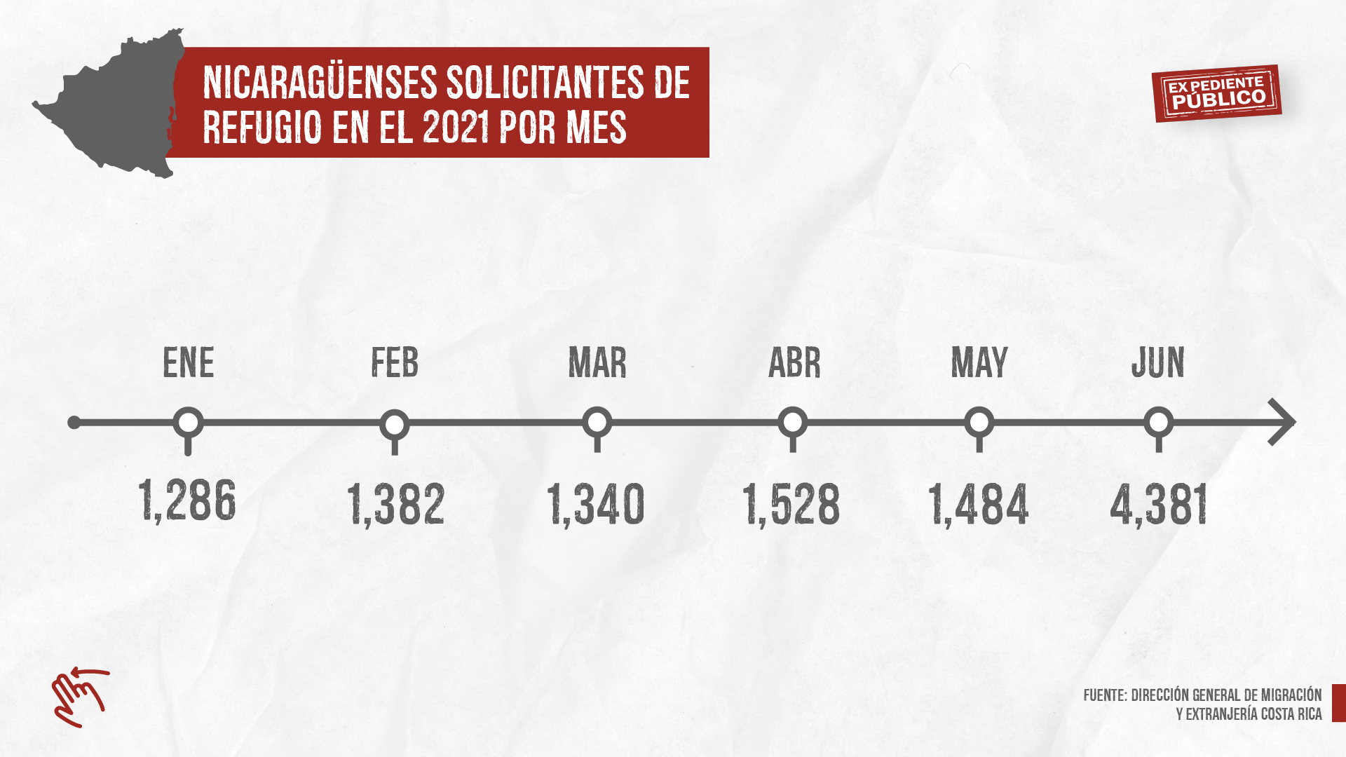 En mayo, la Dirección General de Migración y Extranjería de Costa Rica recibió 1,484 solicitudes de refugio de nicaragüenses, pero al mes siguiente se elevaron a 4,381, durante octubre y noviembre llegaron a superarse las ocho mil peticiones mensuales.
