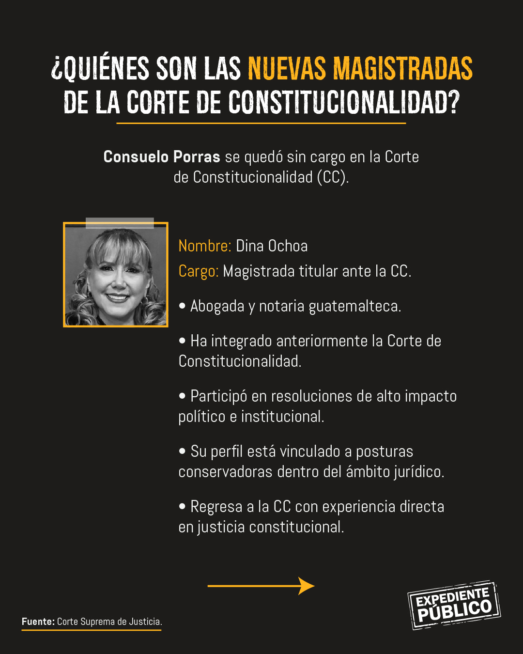 Dina Ochoa, designada como magistrada titular, cuenta con una trayectoria ampliamente vinculada a la justicia constitucional. Ha integrado la CC en anteriores ocasiones, donde participó en resoluciones de alto impacto político y jurídico.