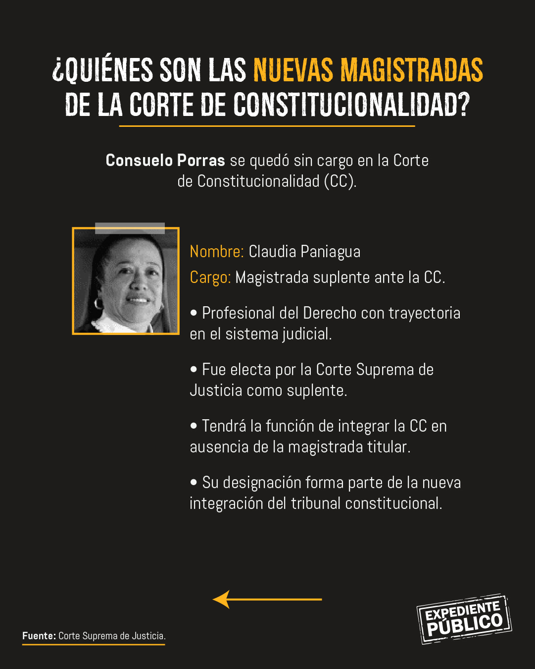 Por su parte, Claudia Paniagua, designada como magistrada suplente, es profesional del Derecho con experiencia en el sistema judicial guatemalteco. Aunque ha tenido menor exposición mediática que Ochoa, su elección responde al respaldo obtenido dentro del pleno de la CSJ.