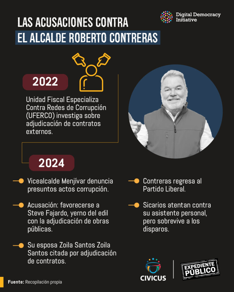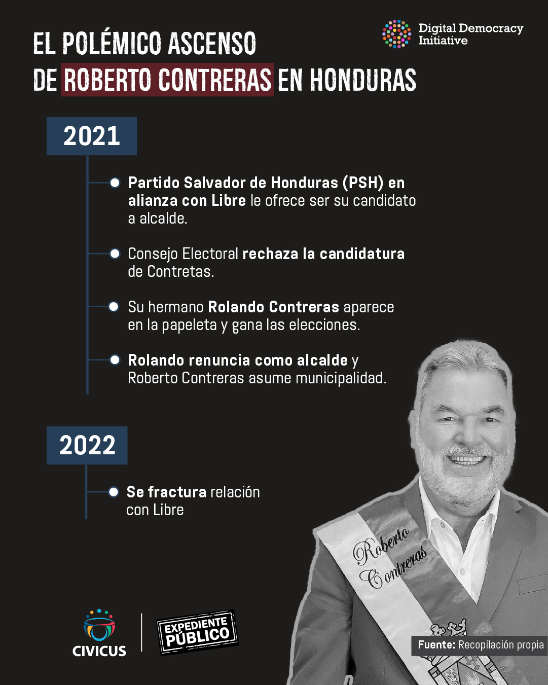 Pese a las acusaciones, Roberto Contreras busca su reelección como alcalde. Él mismo declara en los medios que en Honduras las elecciones no se ganan en las urnas, sino controlando el CNE. Sin embargo, en el órgano electoral su propio partido está representado por Ana Paola Hall, la misma consejera que en 2021 impidió su inscripción como candidato.