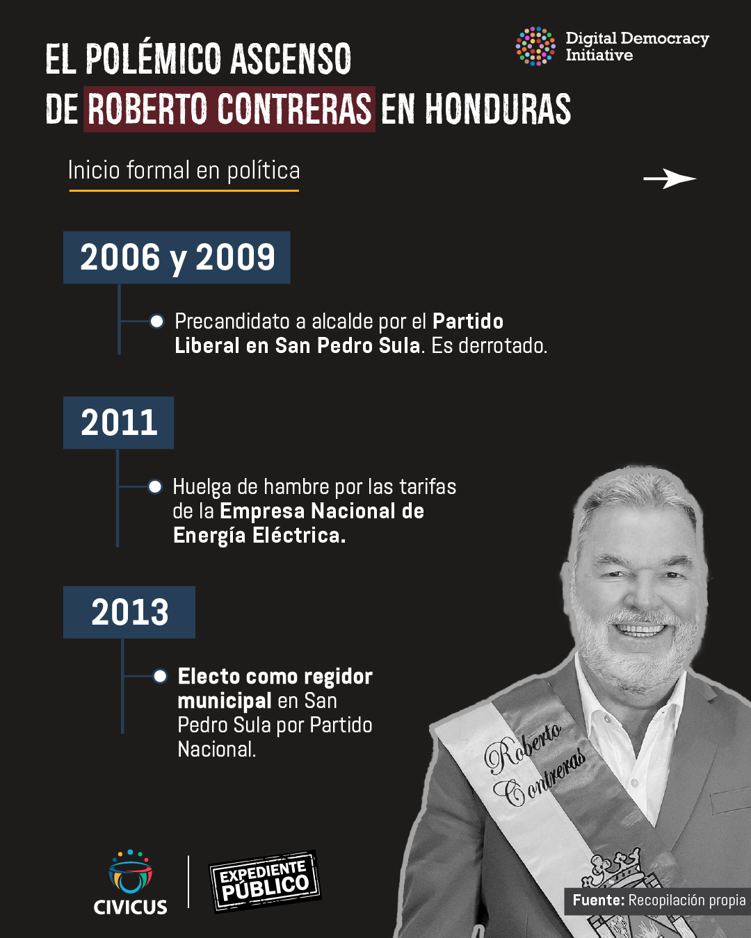 Contreras suele repetir que entró a la política por una razón. «En Honduras, para cambiar las cosas no basta tener dinero, hay que tener poder político», suele decir. Con ese discurso pragmático decidió competir por primera vez en las elecciones de 2005, sin éxito.
